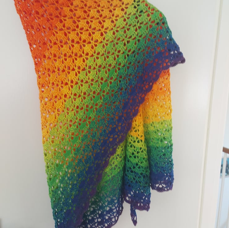 This is a beautiful South bay shawl done in rainbow colours. The photo doesn't do it justice. This would complement any out fit on a summer evening.