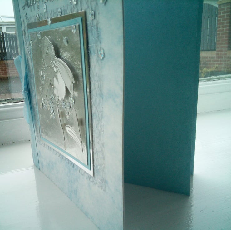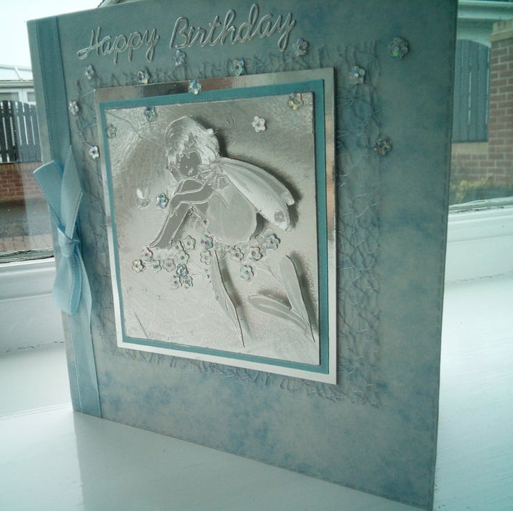 A completely handmade and uniquely designed card. Consisting of a dreaming fairy decoupage cut from silver card. Mounted onto blue, silver mirri, silver angels breath, blue mottled then onto pristine white quality card. Embellished with silver floral sequins. Finished off with pale blue ribbon and bow