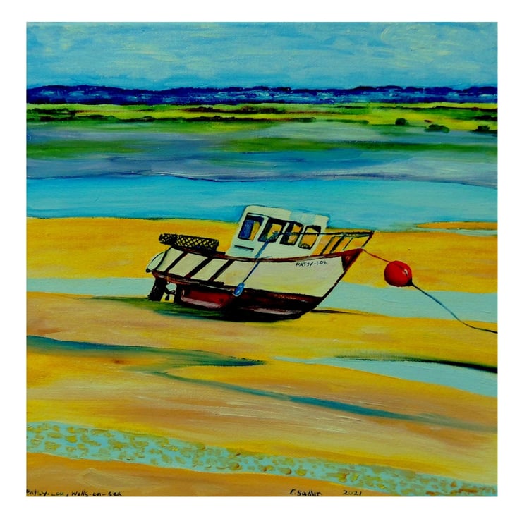 This crabbing boat, the Patsy-Lou sits on the sandbanks of Wells-next-the -Sea on the Norfolk coast. There is a stiff breeze, strong enough to lift the buoy hanging from her bow. The bright sunlight on this summer day brings out the fresh colours of the water and sand as well as the blues of the distant horizon .Painted using alla prima technique with a combination of brush and palette knife.