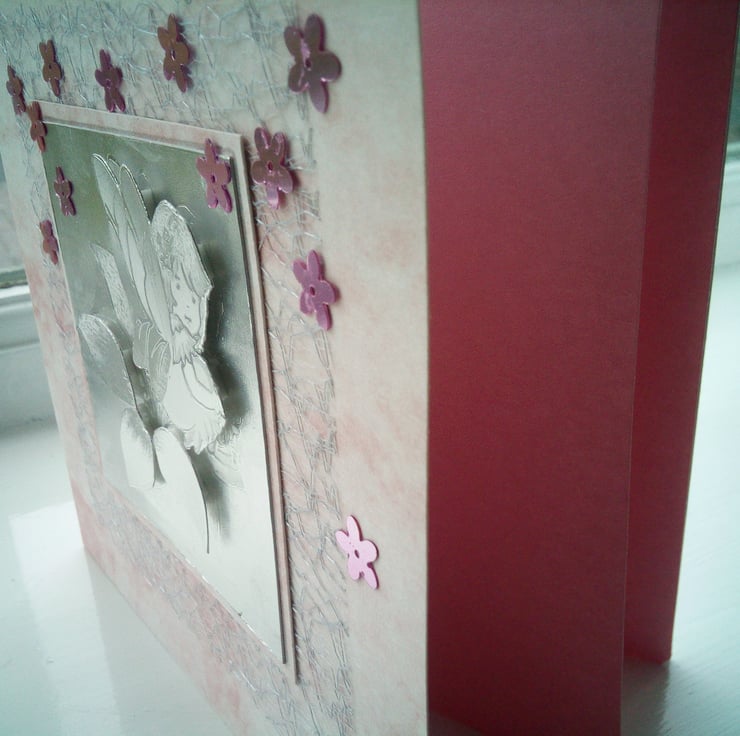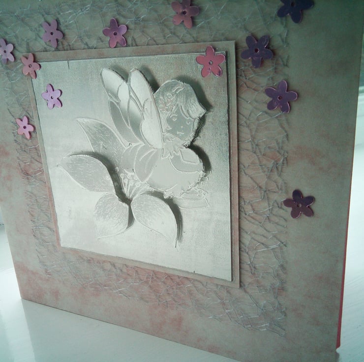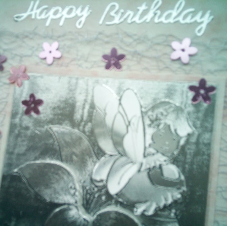 A completely handmade and uniquely designed card. Consisting of a cute fairy decoupage cut from silver card sitting on an orchid. Mounted onto pink mottled, silver angels hair, pink mottled then onto pristine white quality card. Embellished with pink flower sequins. Finished off with happy birthday in silver