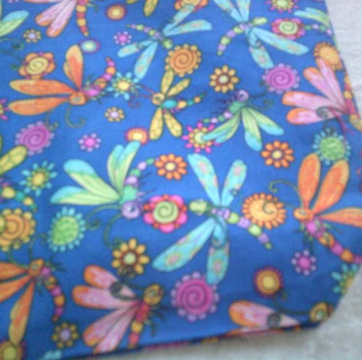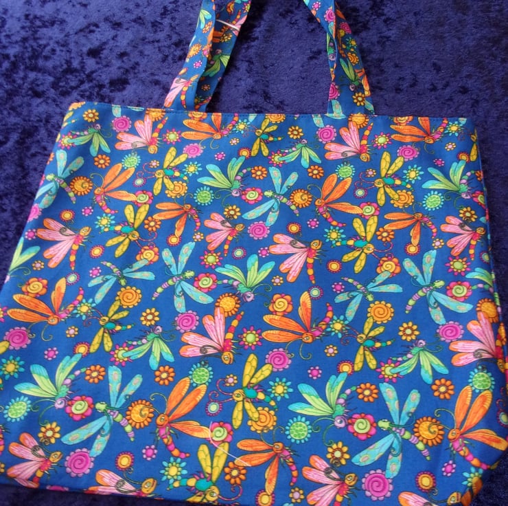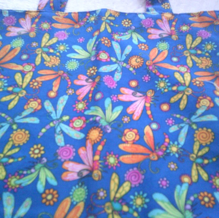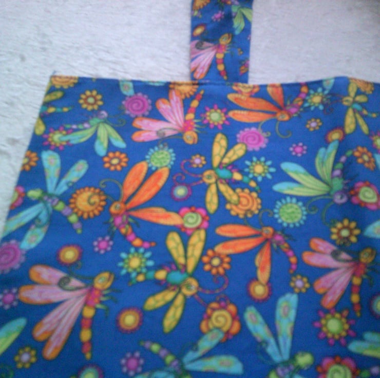 This handy size Eco-friendly shopping bag is made using 100% cotton with colourful dragonflies in blue, yellow and pink on a bright blue background. It is lined with a plain cotton fabric.
