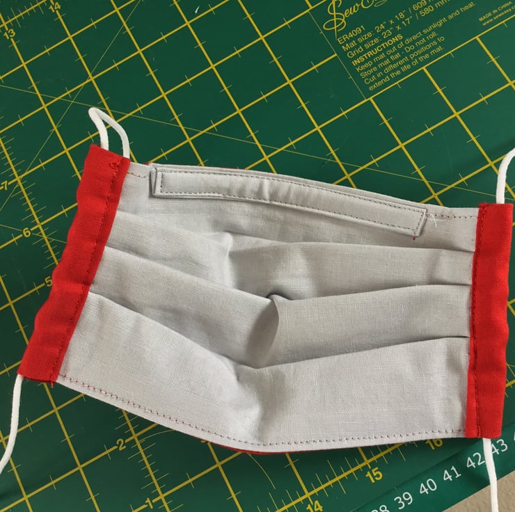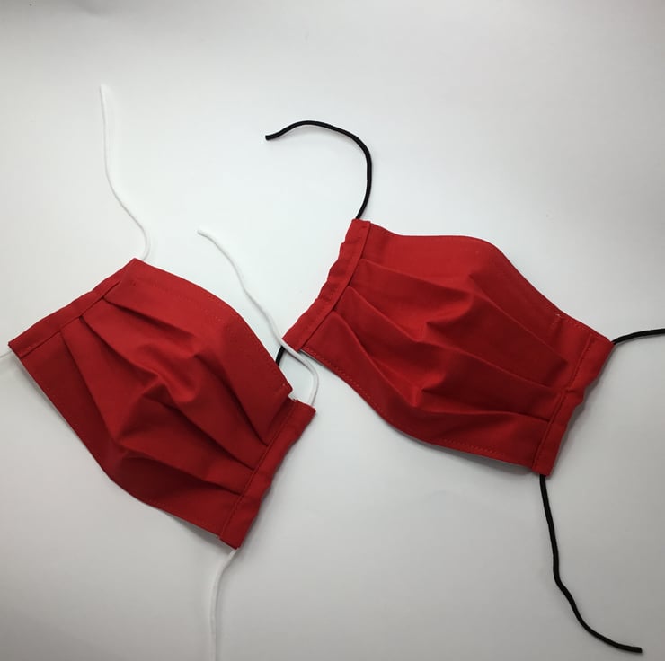 Pleated style face covering with nose wire and soft elastic ear loops, choice of black or white elastic. Size approximately 17cm wide. Triple lined with cotton fabrics, and has a light grey lining.