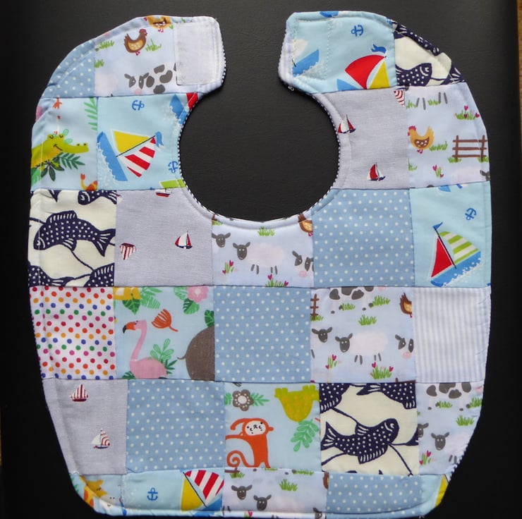 Patchworked mixed cotton fabrics creating interesting multi coloured patterns. Padded wadding layer and navy pinstripe design poly cotton backing. Reversible with velcro fastening.