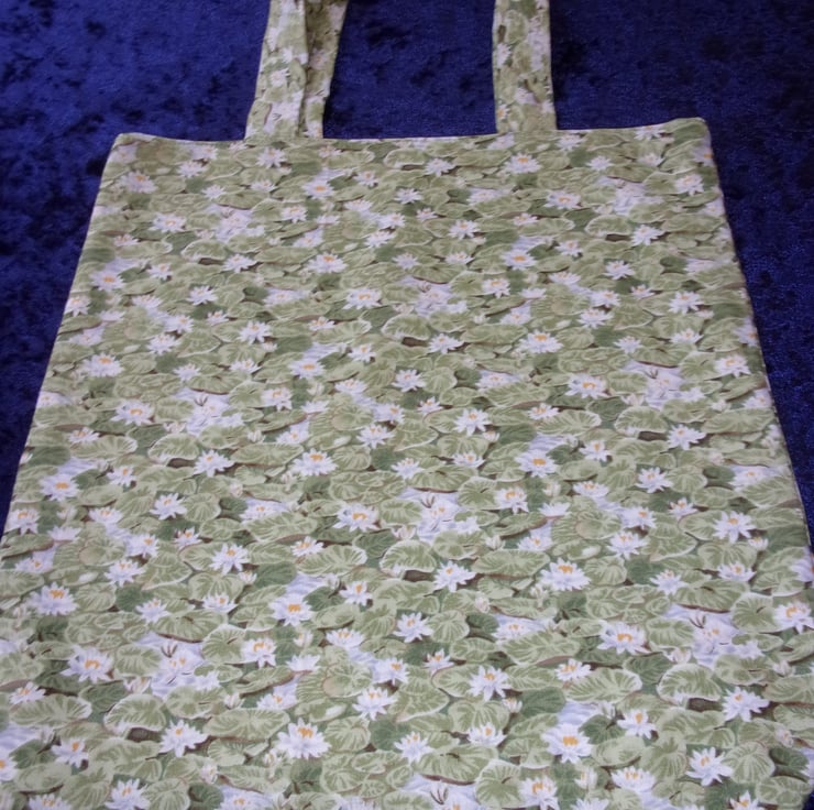 This handy size Eco-friendly shopping bag is made using 100% cotton with and all over design of water lily leaves and flowers. It is lined with a plain cotton fabric.