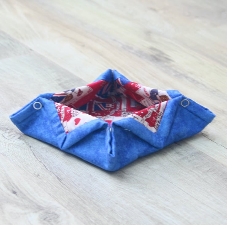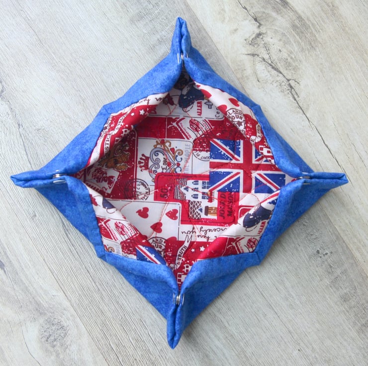Made using a mixture of cream fabric with flags and posters theme and a plain dark blue fabric. These boxes are quilted with an eco-friendly wadding, made using recycled plastic bottles, to give the box some shape. The edges are bound using the blue fabric. There are metal snap fasteners on the corners of the box so it can be laid flat when not in use.