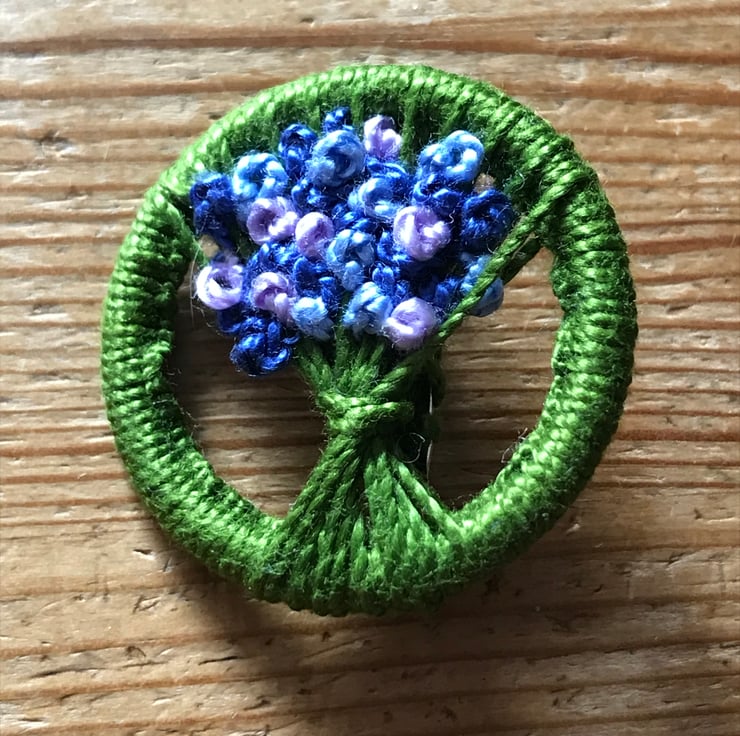 It is worked on a metal ring and measures 3.2 cm across. The ring is covered in a mid green cotton thread and the flowers are worked in French knots in shades of blue and a lilac colour.