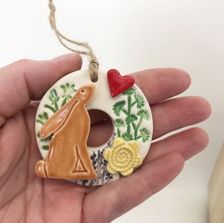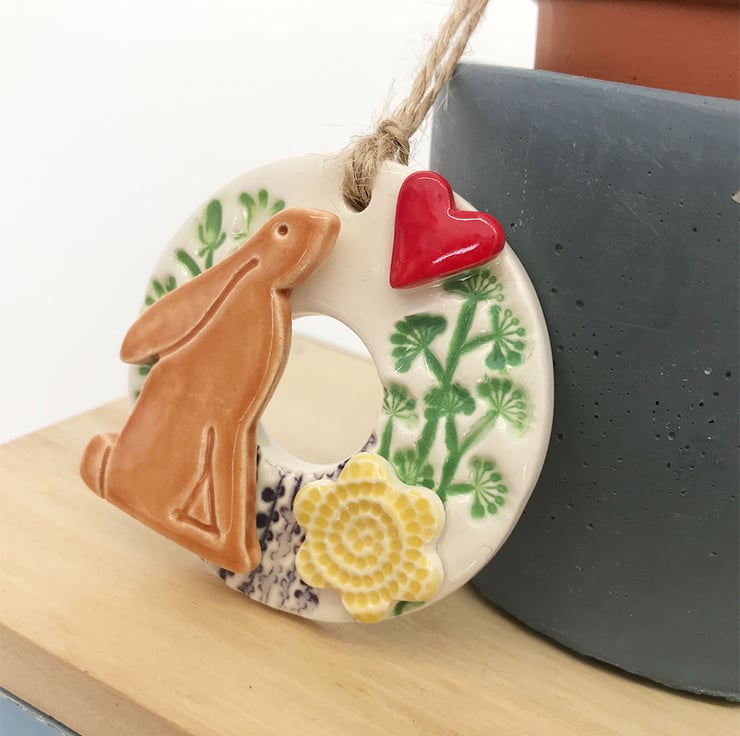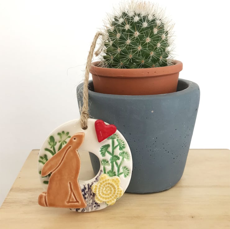 This little pottery hare wreath decoration is made from white earthenware clay and glazed in a rich, glossy clear glaze. It has been fired twice. It measures 5.8cm diameter and hangs from a brown string Decorated on the front only.