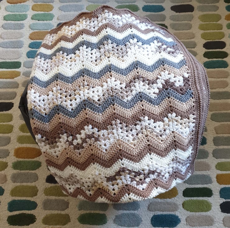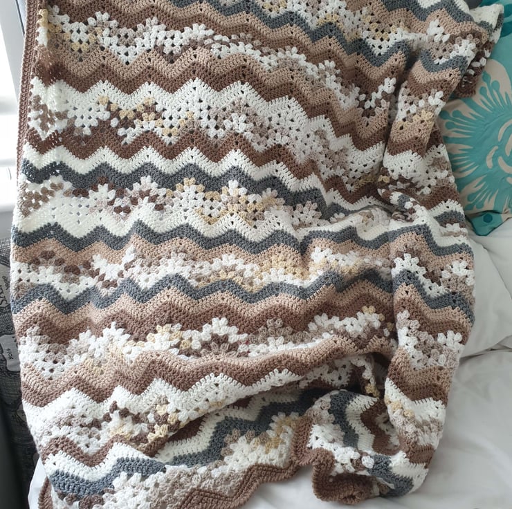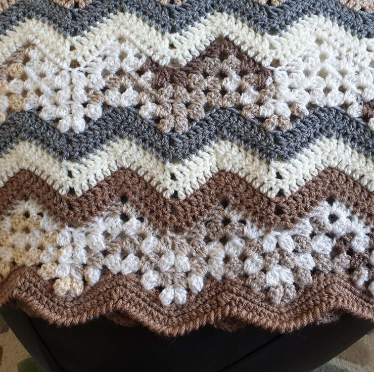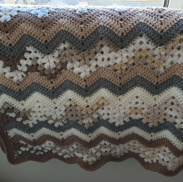The neutral beauty of this crochet throw makes it a versatile fit for a variety of décor styles and colour schemes. Made in an up-to-date version of the ripple pattern using a lovely variegated yarn against plain neutral colours.