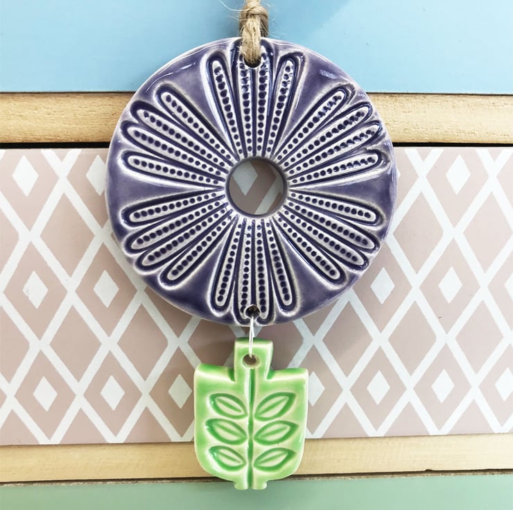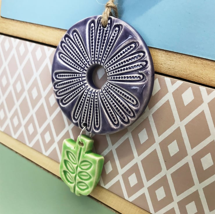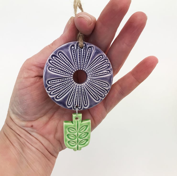 This flower deoration is made from white earthenware clay, imprinted with pattern and finished with a bright, glossy glaze. It has been fired twice, once to the bisque stage and then a second firing for the glaze. It measures 10 centimetres high x 5.5cm wide x 5mm thick.
