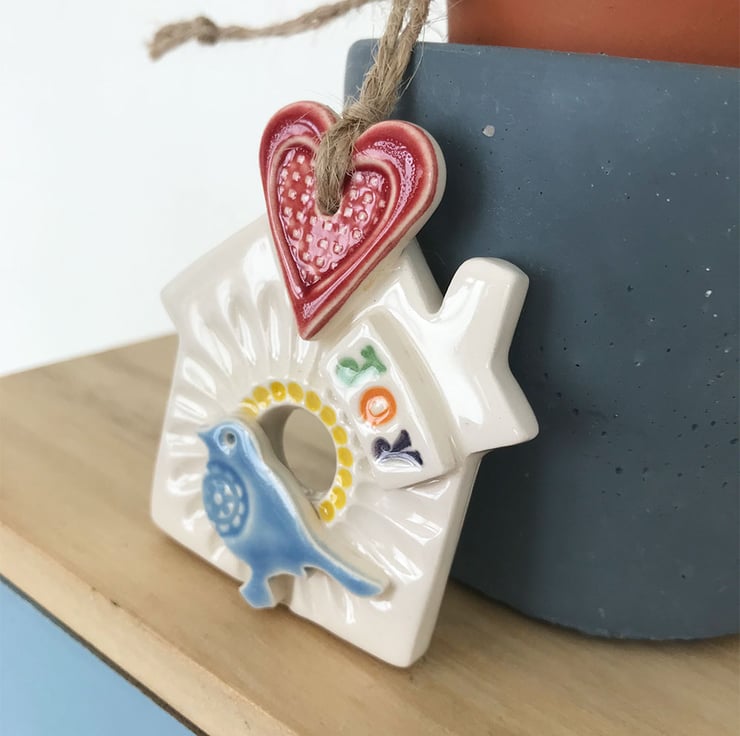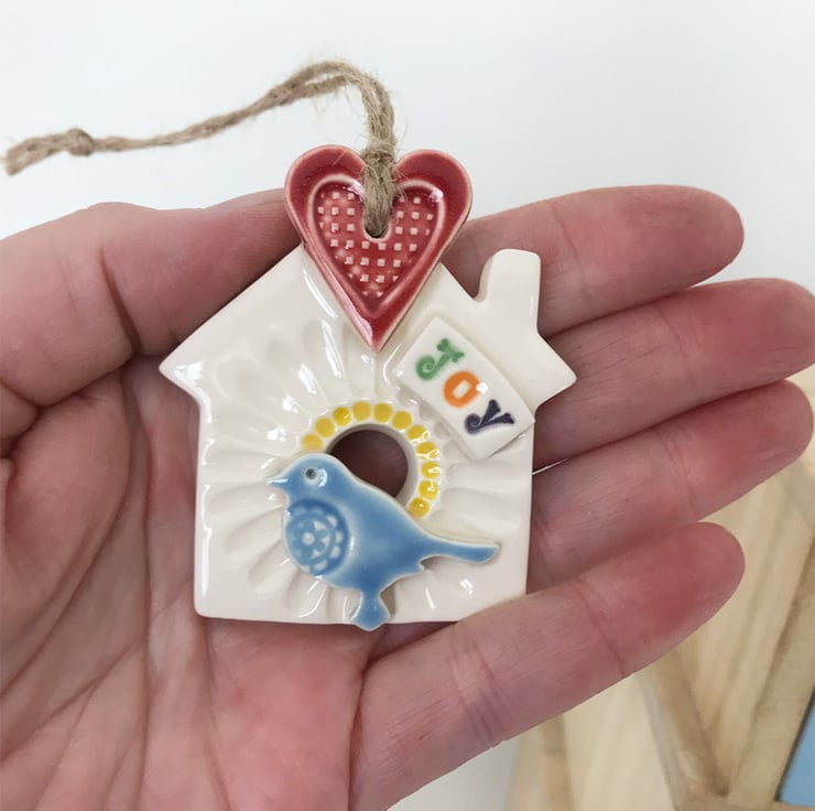 This little bird house decoration is made from white earthenware clay and finshed with a little flower and a bright bird. It has been fired twice and finished with a glossy glaze for a lovely smooth finish. It measures 7.5 x 7cm and hangs from rustic brown string
