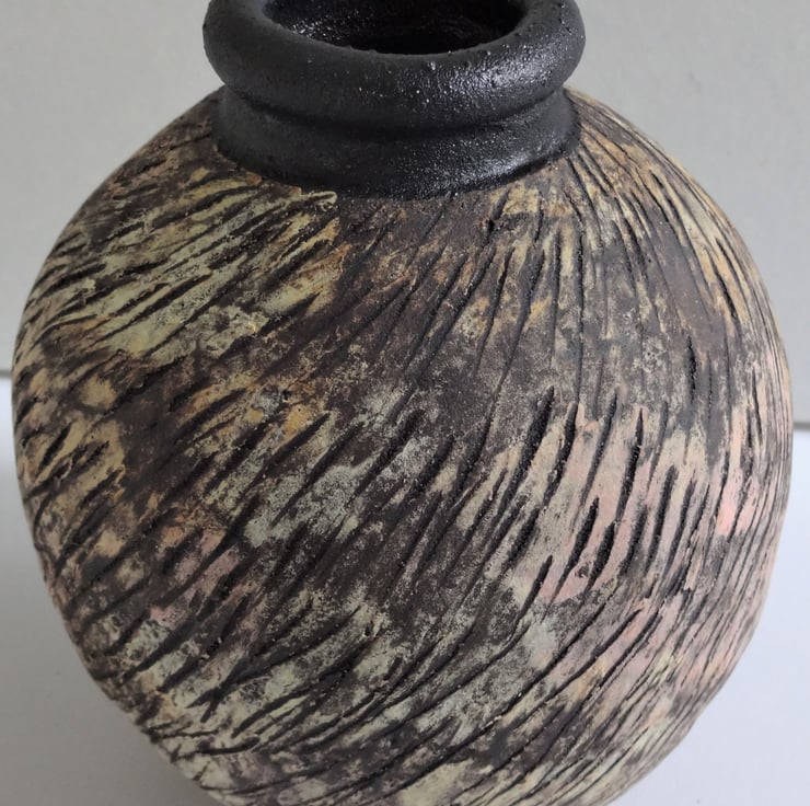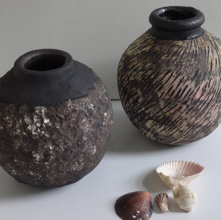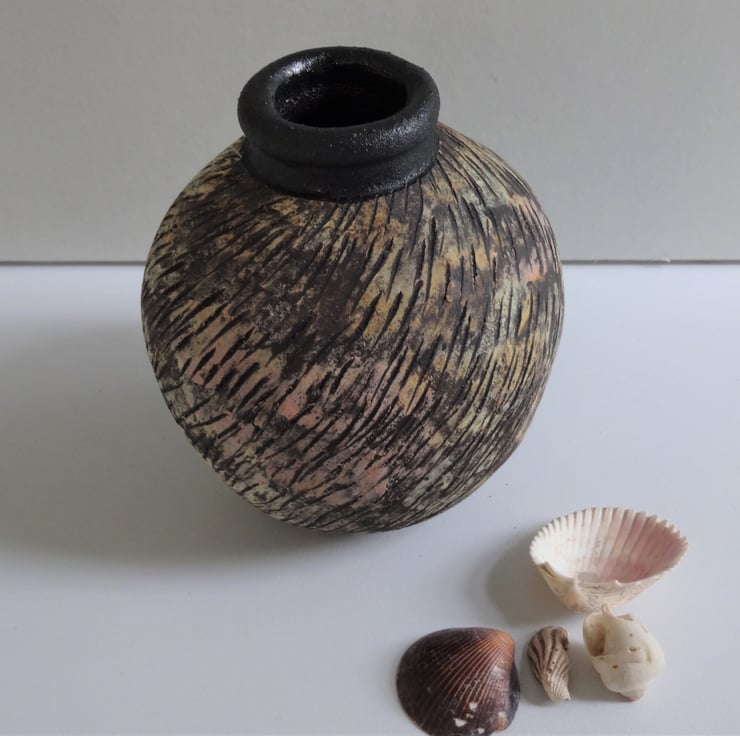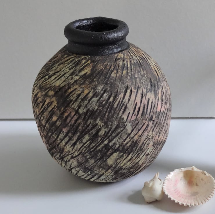 I use a combination of moulding and coil building black stoneware clay, where the form slowly grows as coils of soft clay are added and smoothed into shape. This moon jar is finished with areas of coloured liquid clay applied over the surface, and I then use a bamboo tool to score marks into these areas revealing the black clay beneath, before slowly drying the pot and firing twice, with a final firing to 1185 degrees C over 12 hours. The finish is matt as the clay is unglazed. Height is approx. 12 cms. Looks good as a focal point in minimalist interiors, or as part of a collection of modern ceramics, or to display grasses or twigs in ikebana style. I have also shown another Moon Jar from my collection in one of the images. Please use a mat on painted or polished surfaces as the clay is quite grainy!