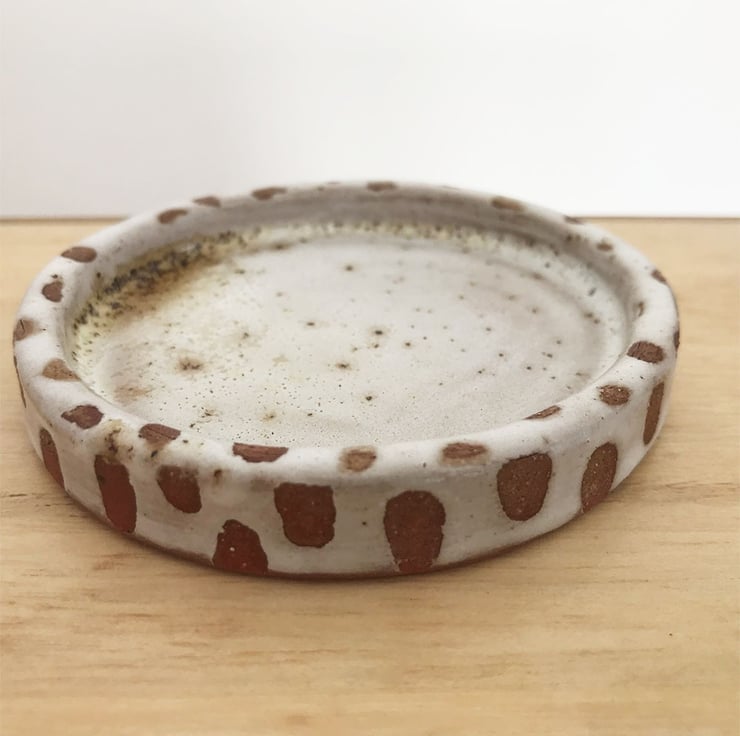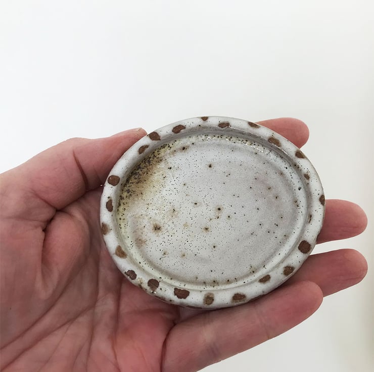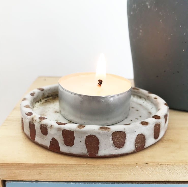This little ceramic dish is made from terracotta earthenware clay. It has been glazed in a matte textured glaze with the terracotta showing through the pattern. Perfect as a tealight holder, trinket dish or even a little incense cone dish. It has been fired in an electric kiln to 1100 degrees. It is oval in shape and measures 6.5 x 5.5cm x 1cm tall. It is quite small, so please check measurements if you are in doubt.