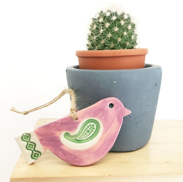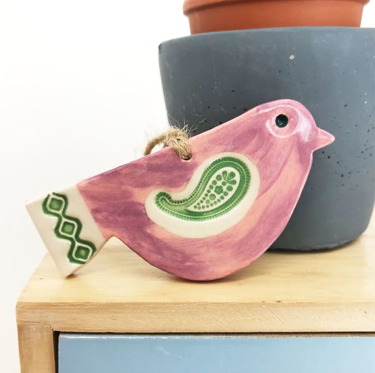 This cute little pottery bird has been hand-cut from a template that I designed myself.