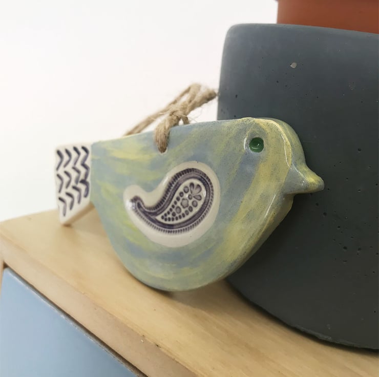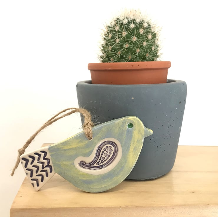 This cute little pottery bird has been hand-cut from a template that I designed myself.