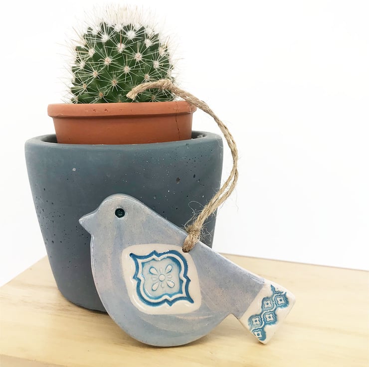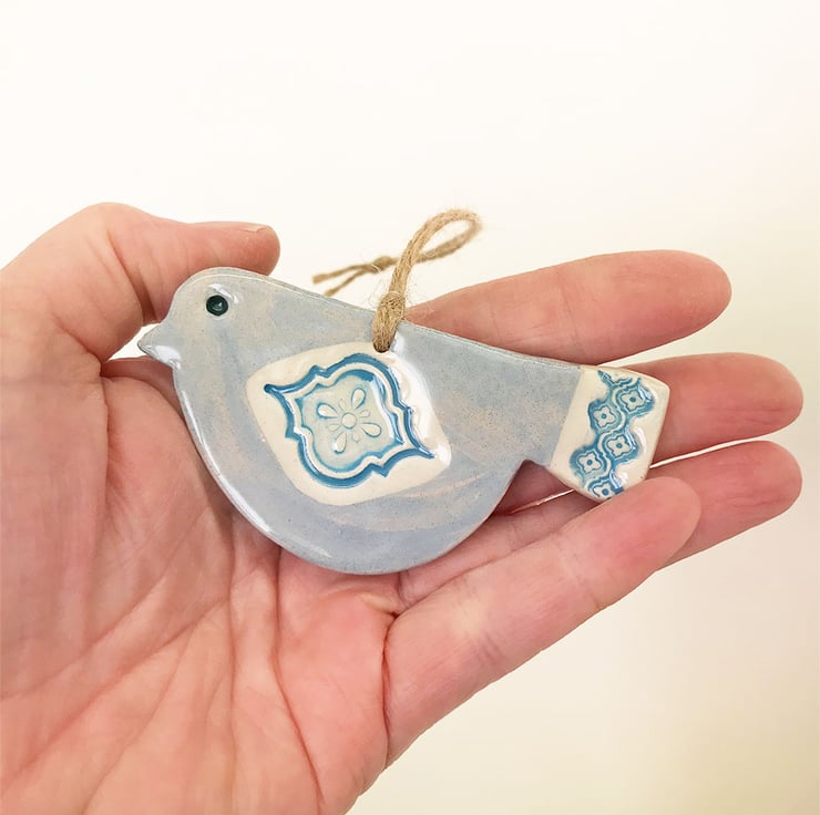 This cute little pottery bird has been hand-cut from a template that I designed myself.