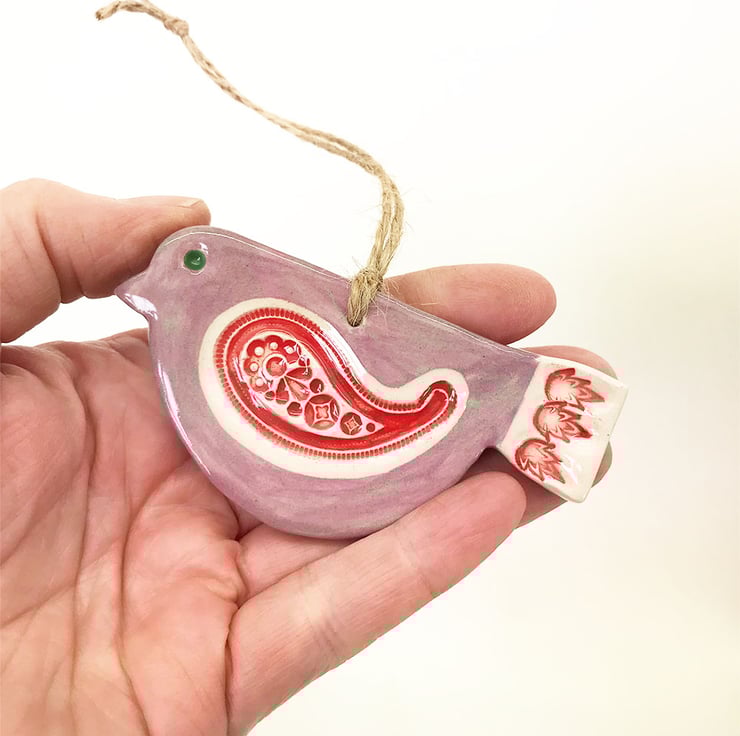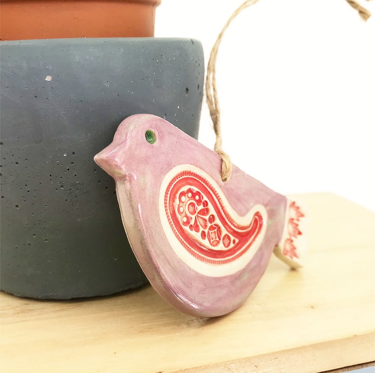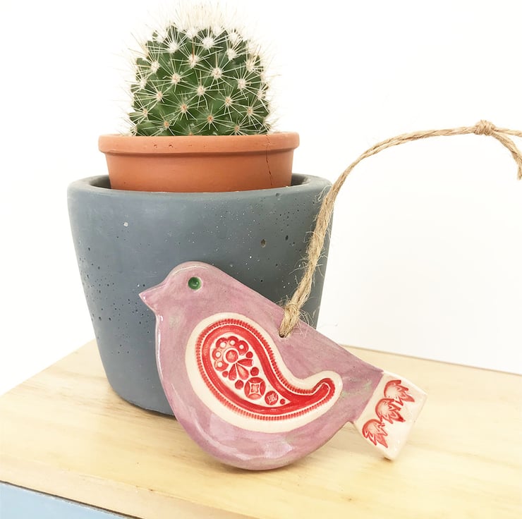 This cute little pottery bird has been hand-cut from a template that I designed myself.