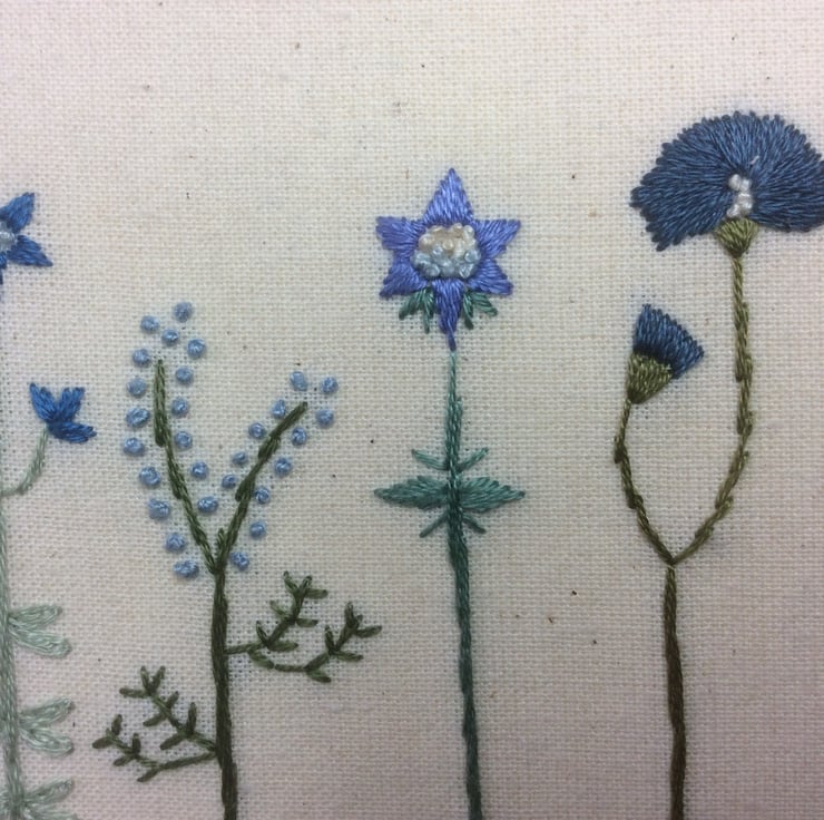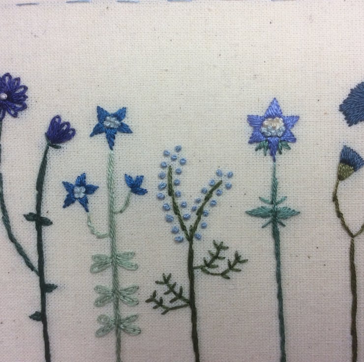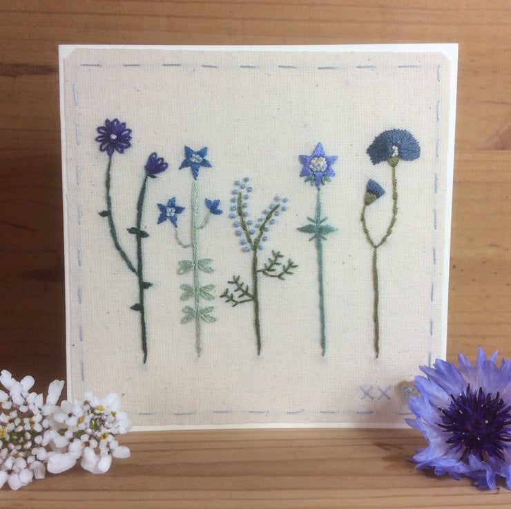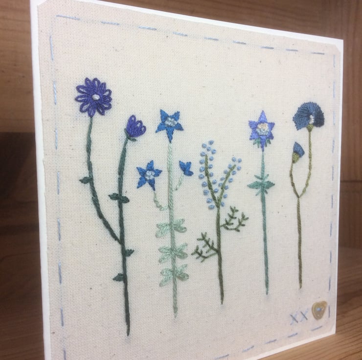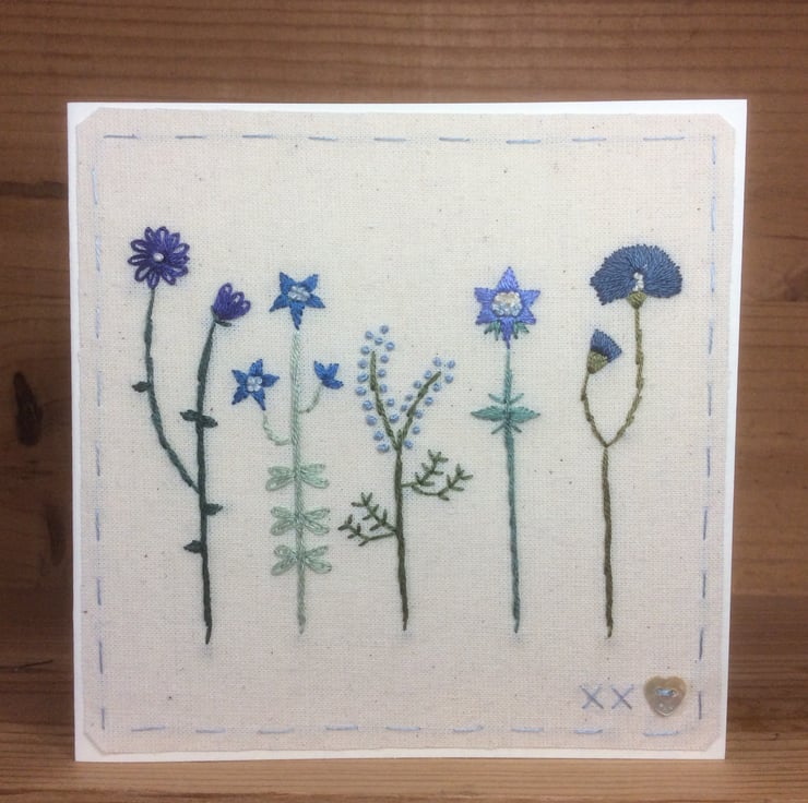 A little row of blue garden flowers feature on this beautifully made hand stitched card. It is one of a kind and perfect for framing to make a lasting gift for the recipient. Perfect for any occasion the card has been freehand embroidered by myself onto a calico background and backed onto cream card with matching envelope.