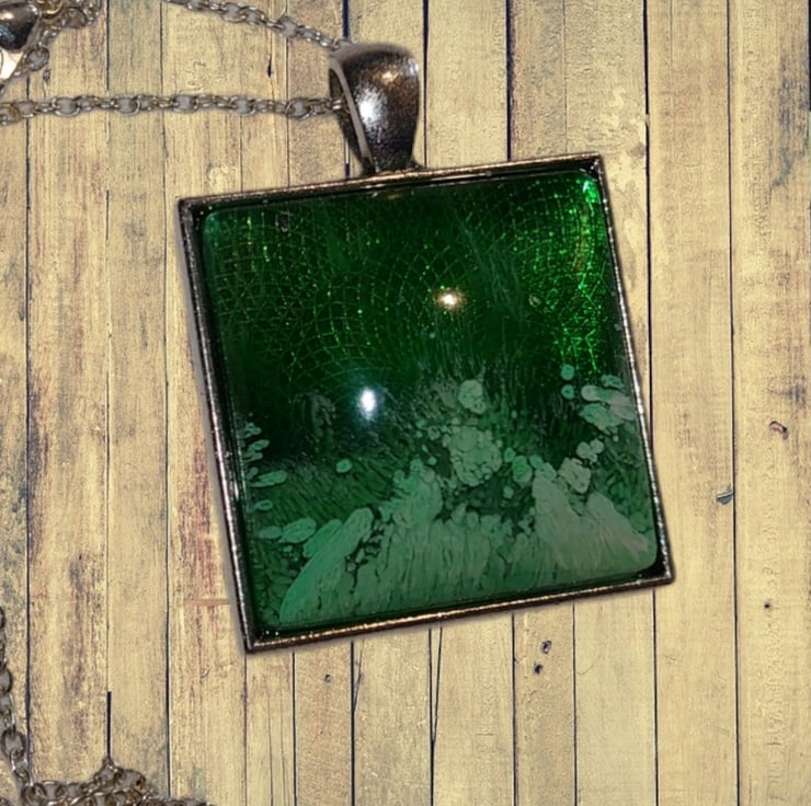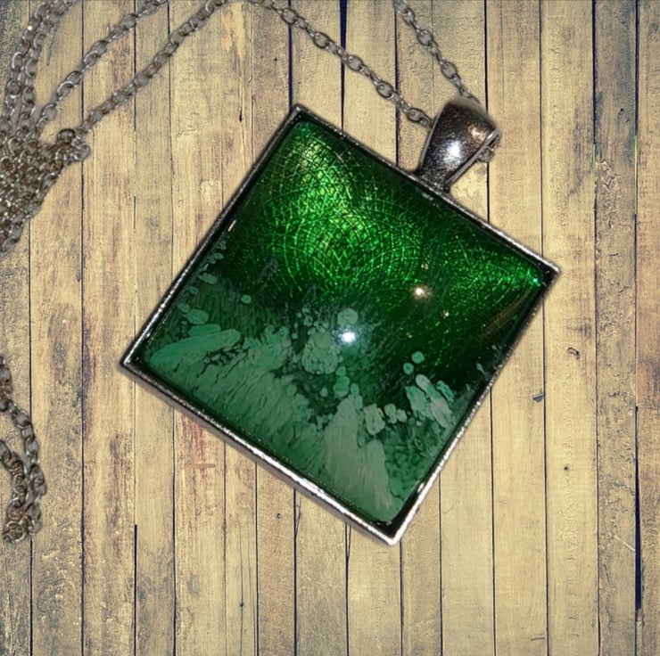 This is a simple square pendant with a vibrant green and white resin finish. It is semi transparent in the top half.