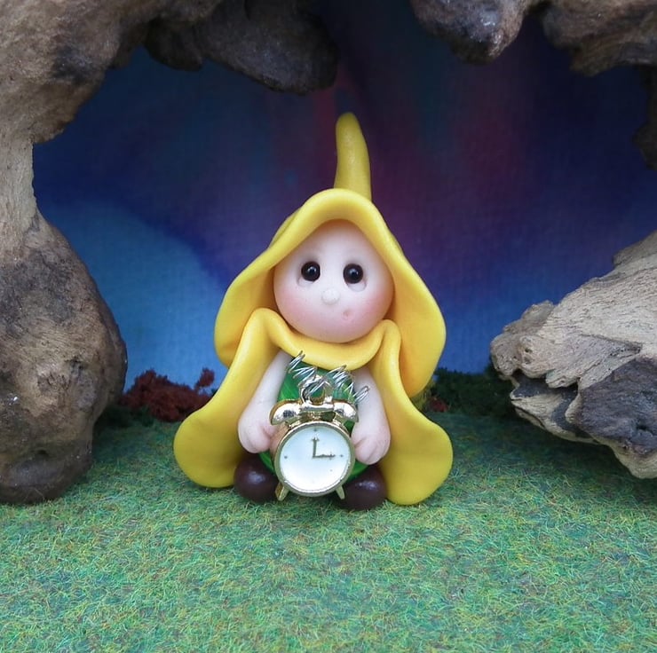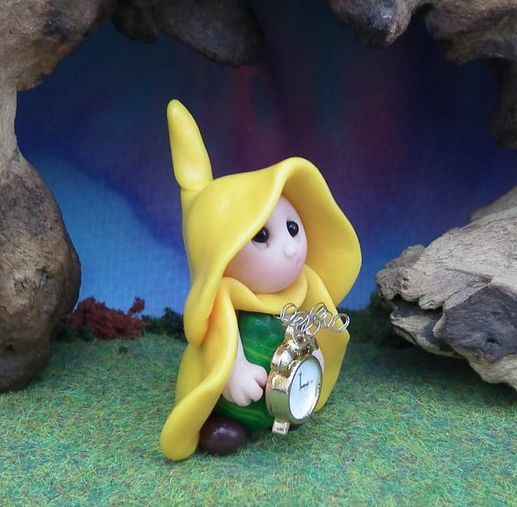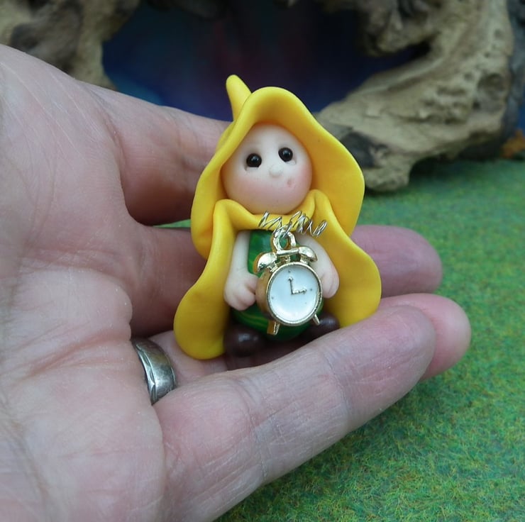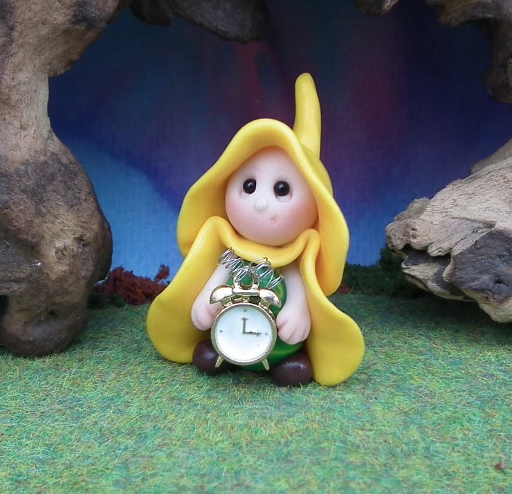 This is a 'one of a kind' creation having been entirely handmade without the use of moulds here at my studio on the Sussex Coast. Modelled with Prosculpt polymers, painted with heat set paints before sealing with lacquer, Peta has sparkling black onyx eyes and a wired metal clock. Peta the Gnome is just one and a half inches tall.