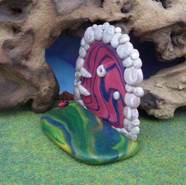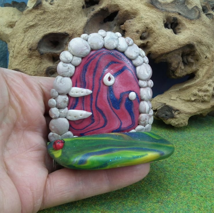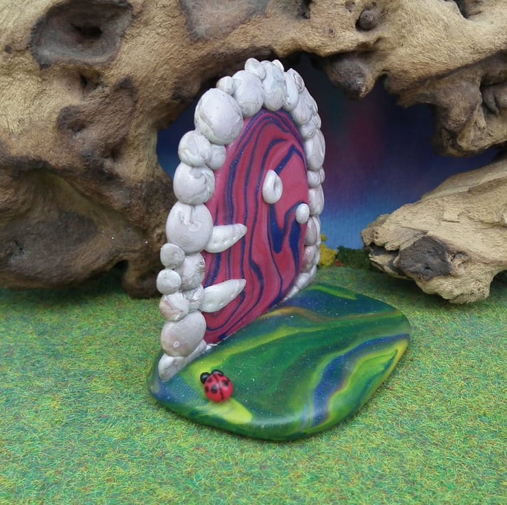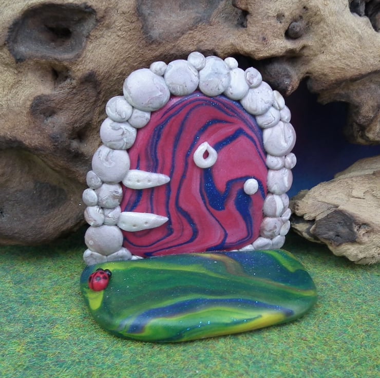 This is a 'one of a kind' creation having been entirely handmade without the use of moulds here at my studio on the Sussex Coast. Modelled with Prosculpt polymers, painted with heat set paints before sealing with lacquer, The door is two and three quarter inches high, set into the base with a tiny ladybird, so will stand freely with no attachments needed.