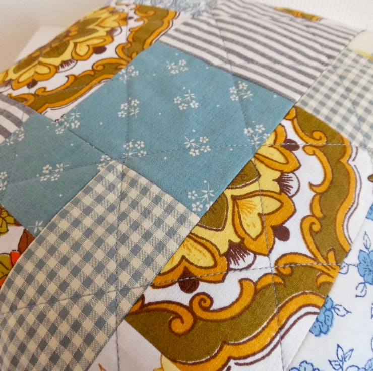 I made the front of this cushion with a random patchwork of cotton and poly/cotton fabrics in blues, greys and yellows. I backed it with two layers of fabric and then machine stitched with diagonal rows of stitching in light grey thread.