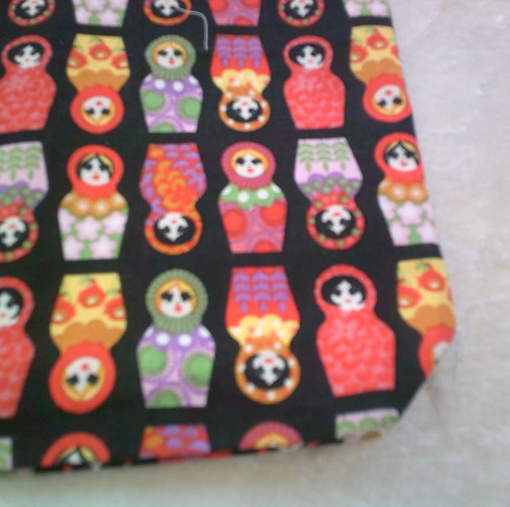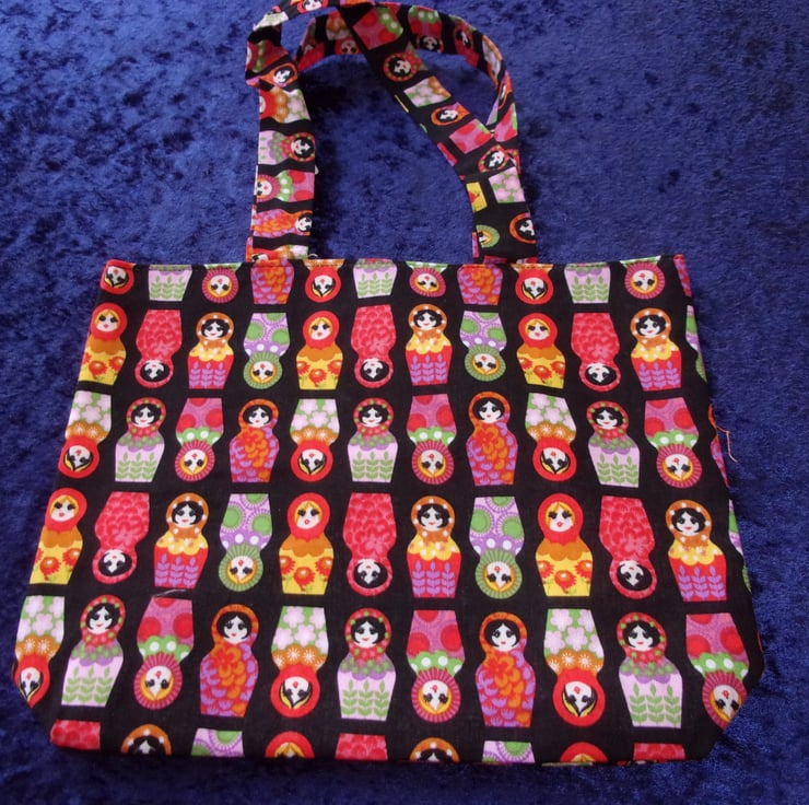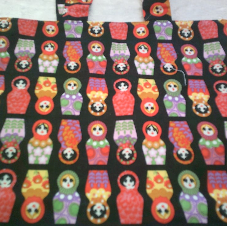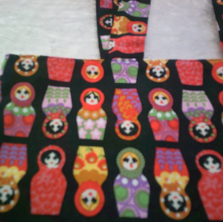 This Eco Friendly, fabric bag is made using 100% Cotton and features brightly coloured Russian Dolls on a black background. It is fully lined and machine washable.