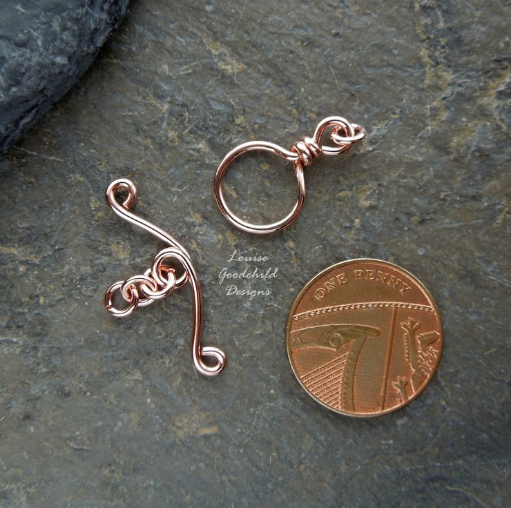 Hand-forged two-part toggle clasp, made from solid copper 1.2mm wire, which has been carefully shaped, filed and tumbled for strength and shine. Includes 4 x handmade jump-rings made from 1mm copper wire. Please see the photo with the penny for approximate size.