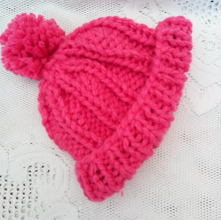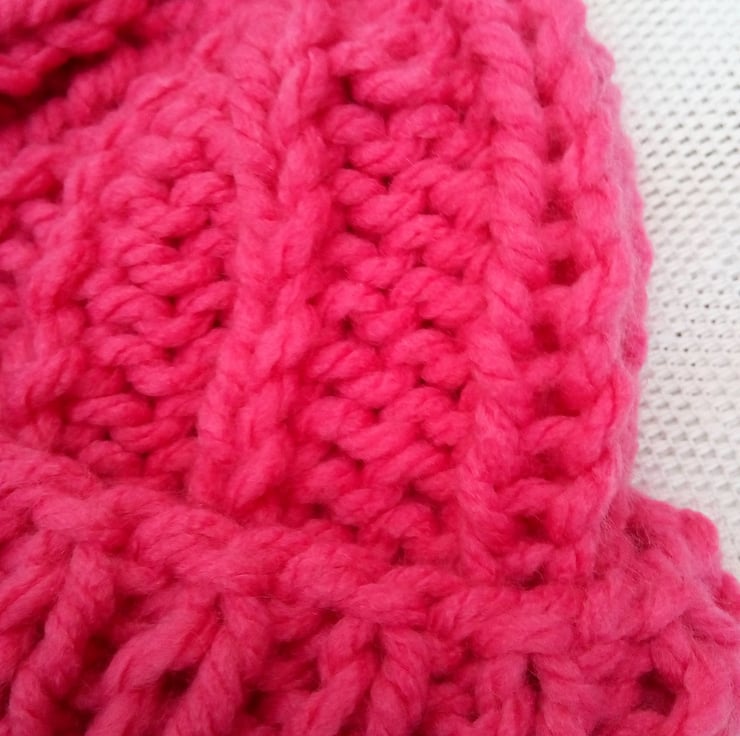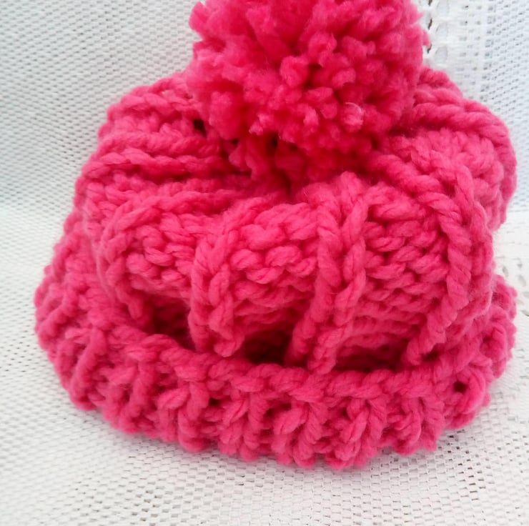 Hand knitted winter large rib hat with pom pom. The hat is made to fit an average size child's head for the age indicated below. This super chunky knit hat would make an ideal gift for a birthday or just as something to keep your little girl warm on a chilly day.