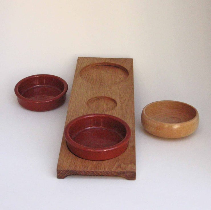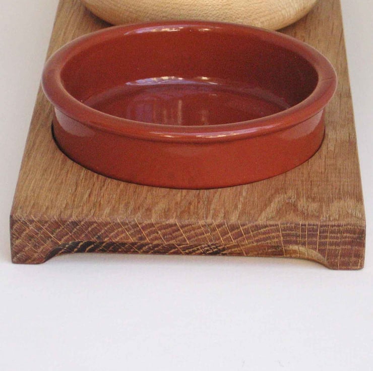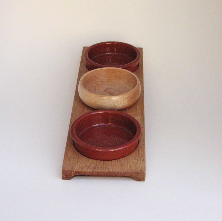 A platter for serving snacks or tapas. The base of the board is oak and the turned bowl is maple. The wooden pieces have been given a food safe mineral oil finish and can be simply wiped clean. The two ceramic dishes were recycled courtesy of a well known supermarket.