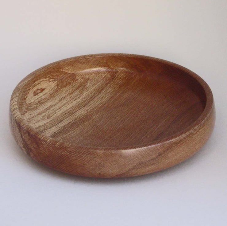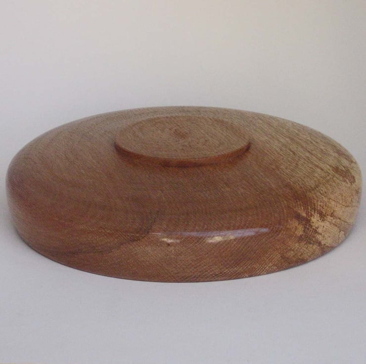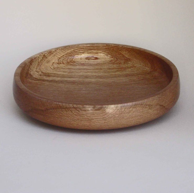 A bowl turned in well figured oak. It has generous dimensions and would make a decent fruit bowl. The finish is a food safe, durable lacquer and will simply wipe clean.