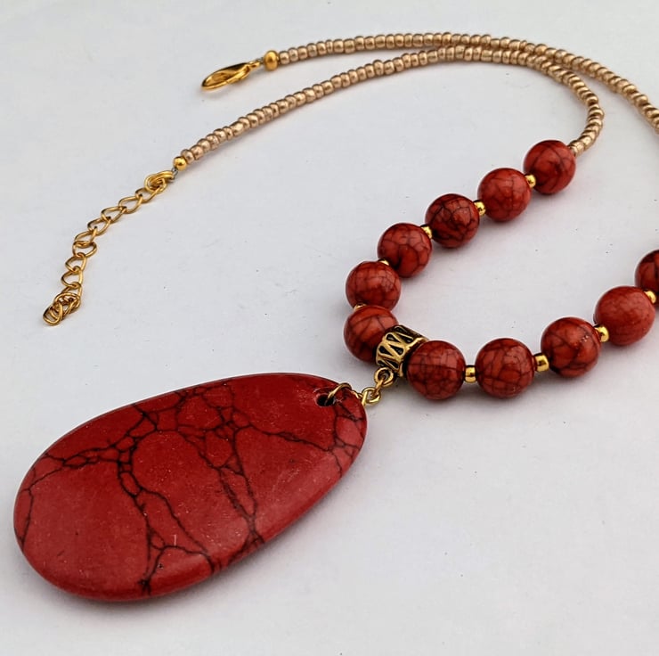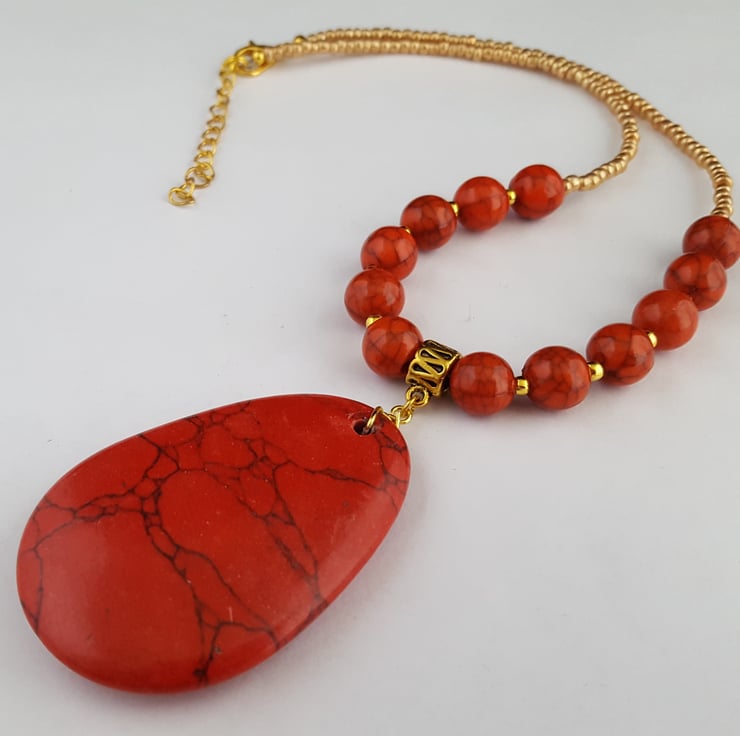 15" necklace of 10mm acrylic coral marbled beads and metallic gold seed beads, with a 60x40mm coral marbled stone pendant. With 12mm gold plated lobster clasp fastening and 2" extension chain. In an organza gift bag.