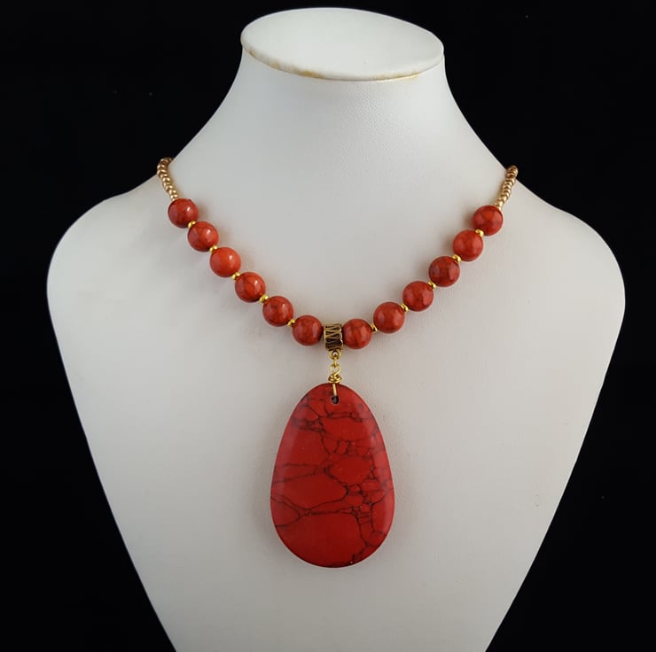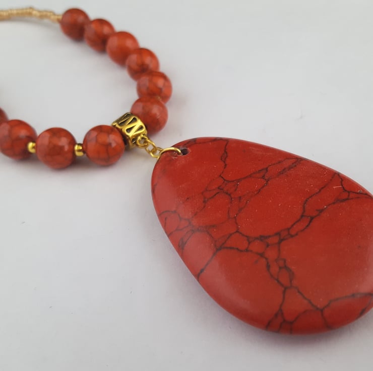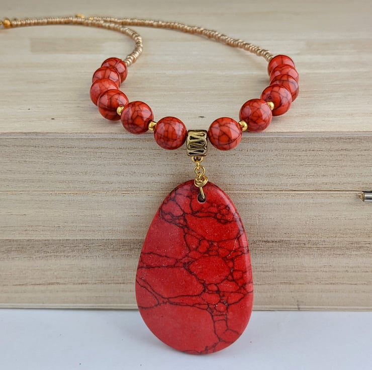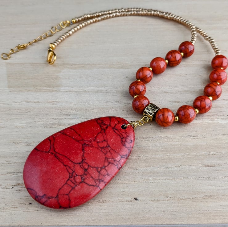 15" necklace of 10mm acrylic coral marbled beads and metallic gold seed beads, with a 60x40mm coral marbled stone pendant. With 12mm gold plated lobster clasp fastening and 2" extension chain. In an organza gift bag.