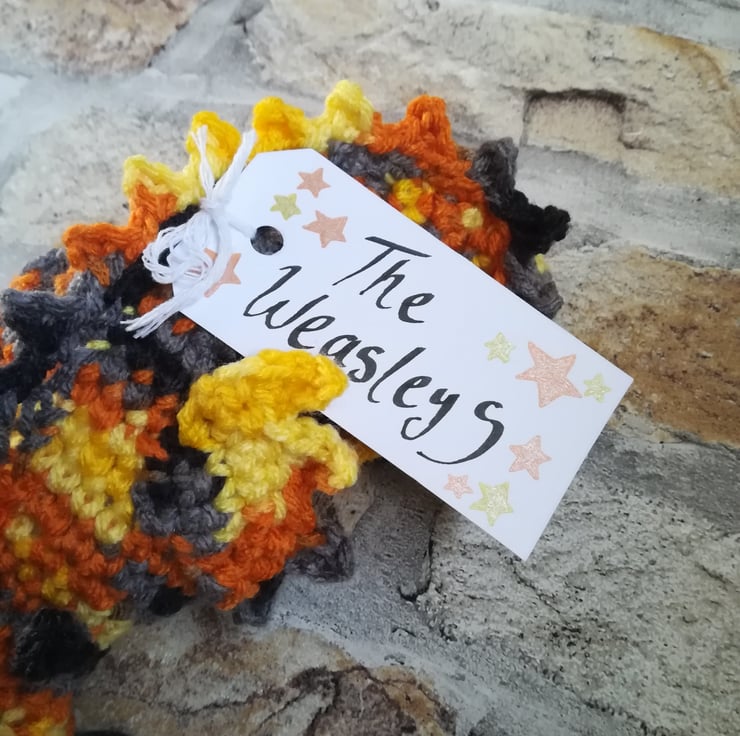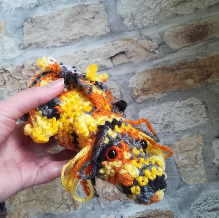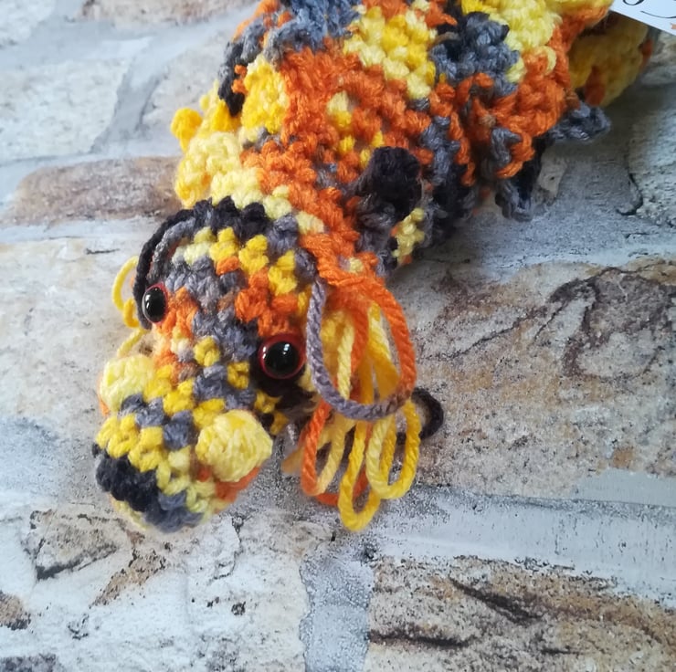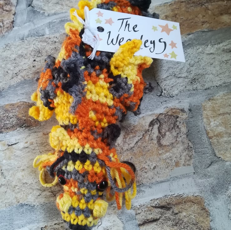 This dragon is made using a lovely mottled yarn in shades of yellow, orange, grey and black. He has a custom tag and measures about 9 x 4 inches.