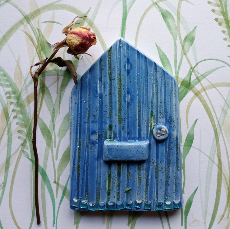 This lovely blue fairy door is embellished with blue and silver gemstones ad decorated with a green glitter. It is just over 9.5 cm high to the top of the arch. My fairy doors are easy to attach with glue dots on the back.