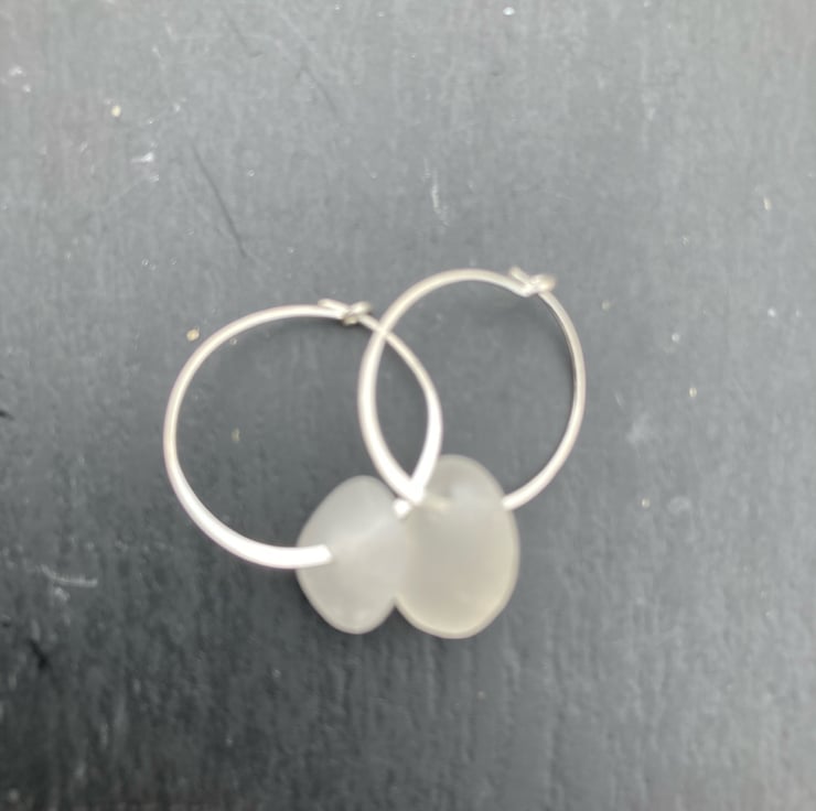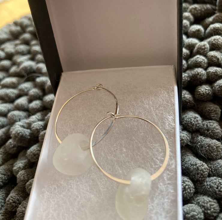 Sterling silver 2cm diameter hoop earrings, for pierced ears, have small smooth pieces of white seaglass threaded onto them. The seaglass pieces are approx 1.3cm at the longest part. The seaglass pieces are a good match but every piece of seaglass is unique due to the effect of the sea, sand & stones on the glass, the time it has spent in the sea and the original make up of the glass. This make a truly unique item of jewellery.