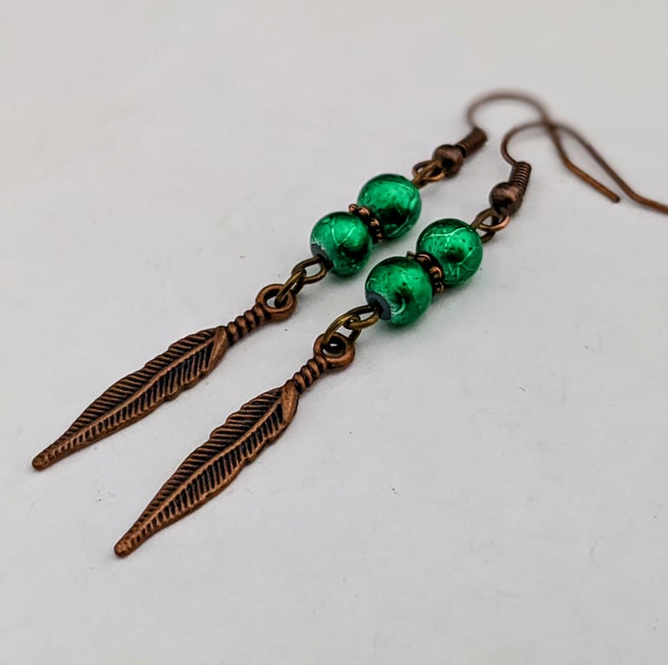 6mm emerald green metallic coated glass beads and 25mm copper tone feathers on hypo allergenic hooks.