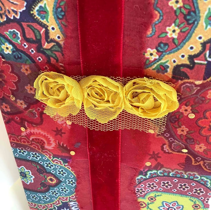 Then across mid section is a red with gold spots organza ribbon followed by a lush red velvet ribbon down centre finally topped off with 3 bright yellow flowers.