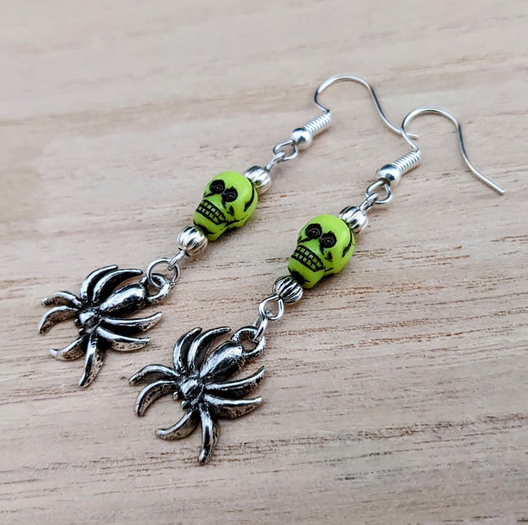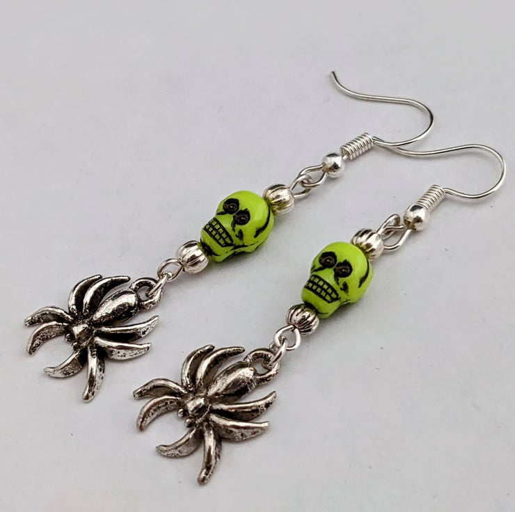 10mm lime green resin skulls and 20mm Tibetan silver spiders on hypo allergenic silver plated hooks.