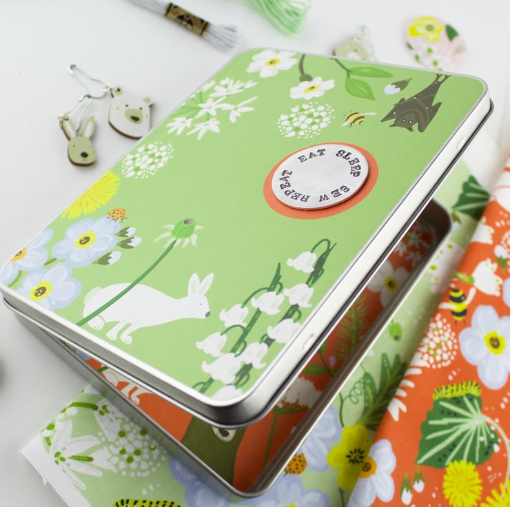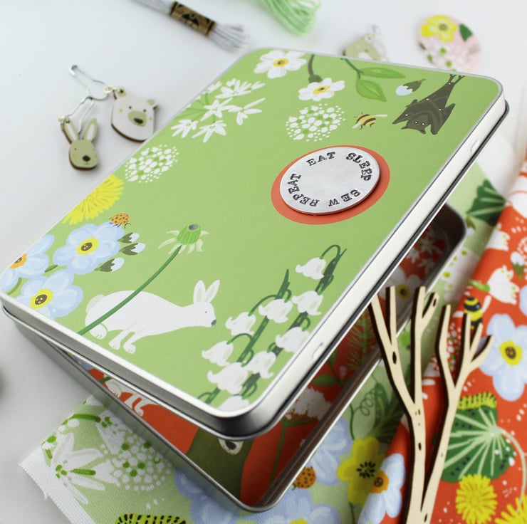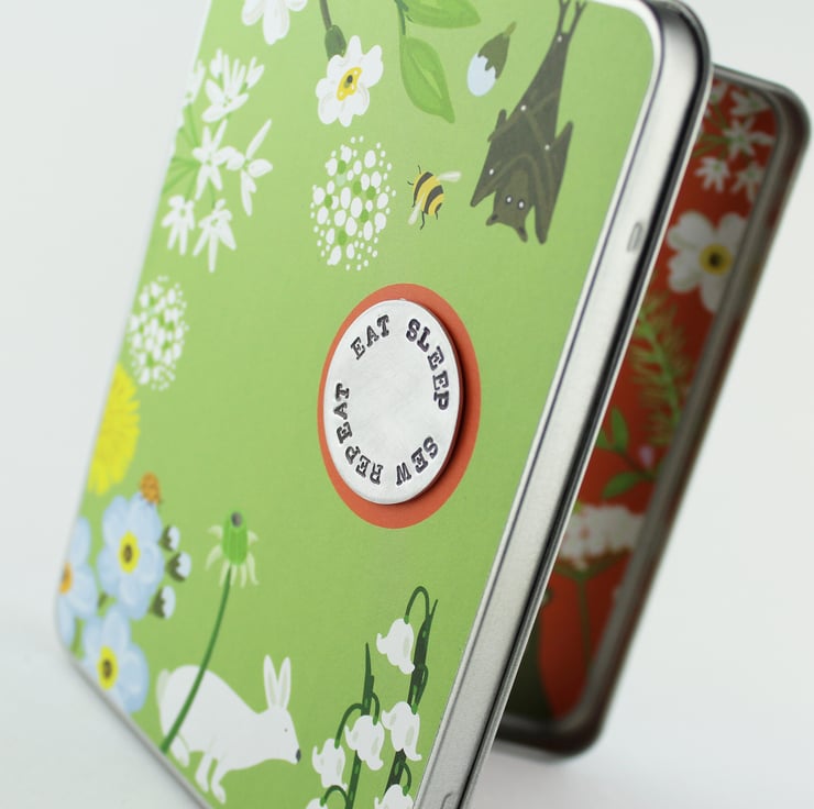 These craft tins are new for Spring. They are illustrated with my new fabric design "bunnies bats and bees". The tin has a metal stamped embellishment on the front that says 'eat sleep sew repeat', this can be altered to be your own message.