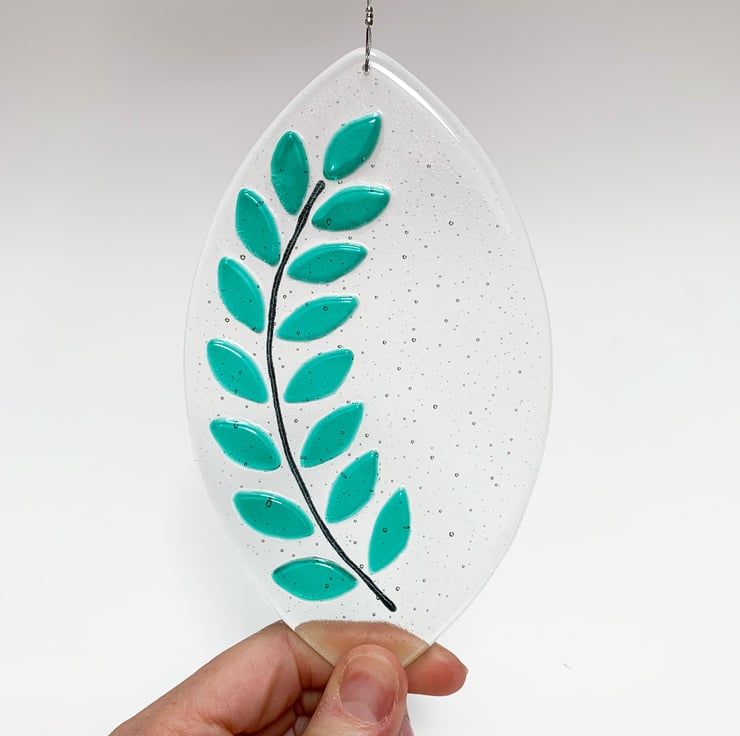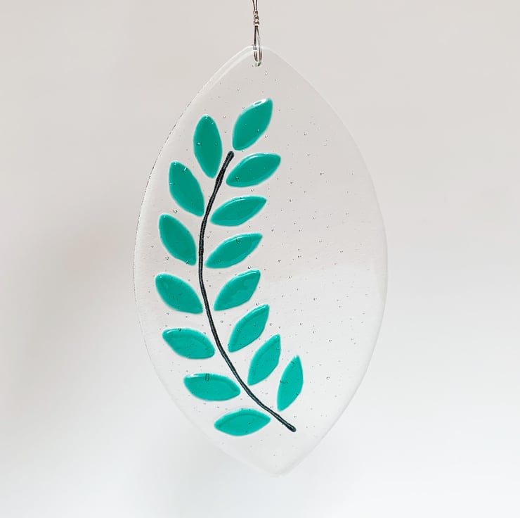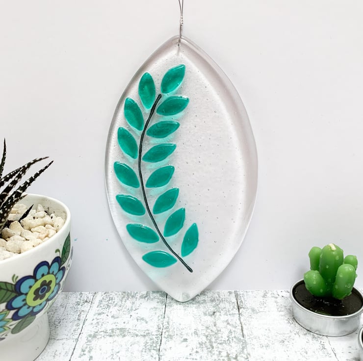 Fused glass hanging suncatcher, inspired by leafy green foliage. This suncatcher looks beautiful when hung in a window or against a plain wall. A beautiful gift for a friend or relative who loves nature.