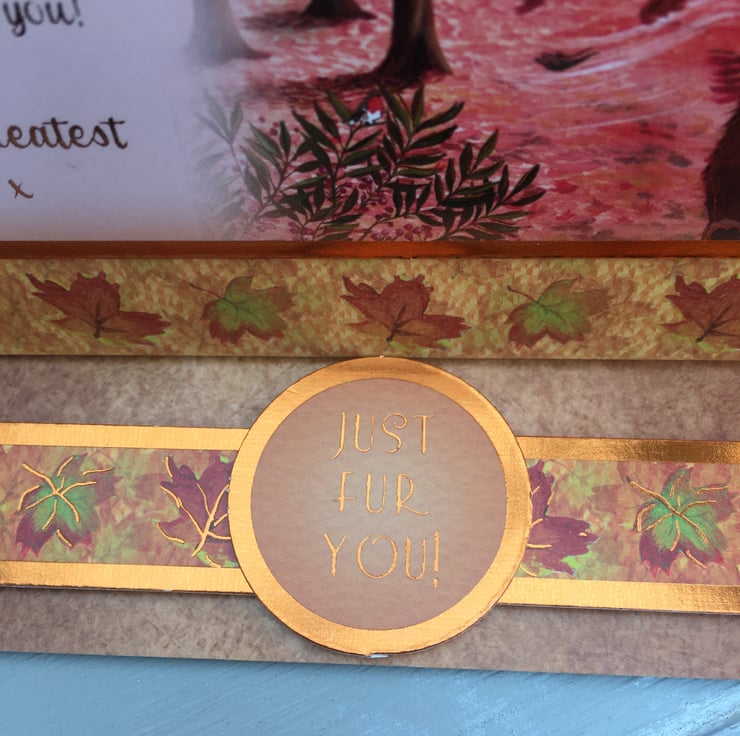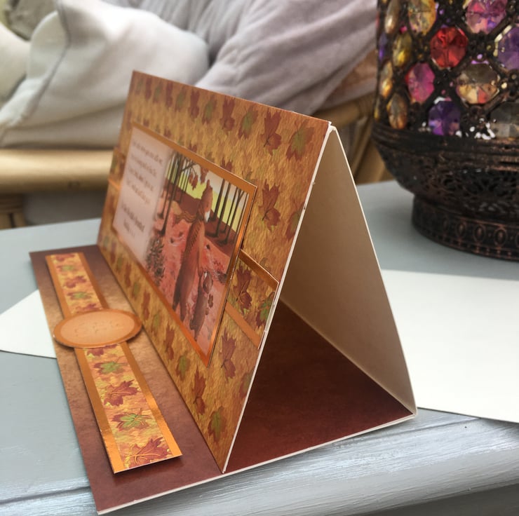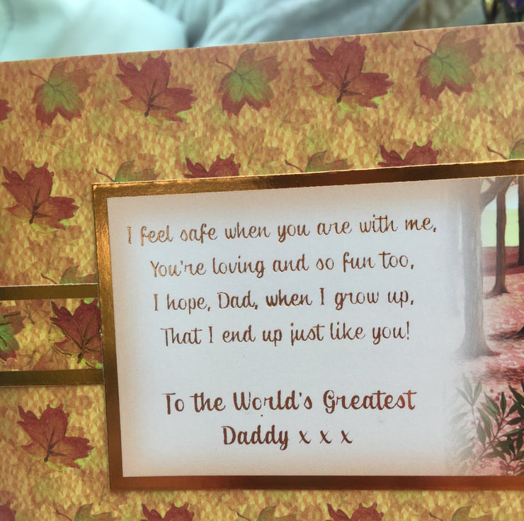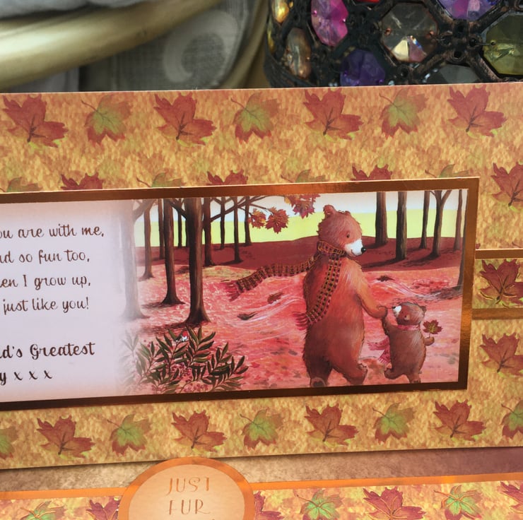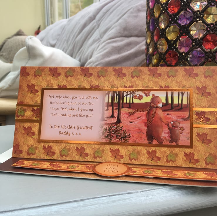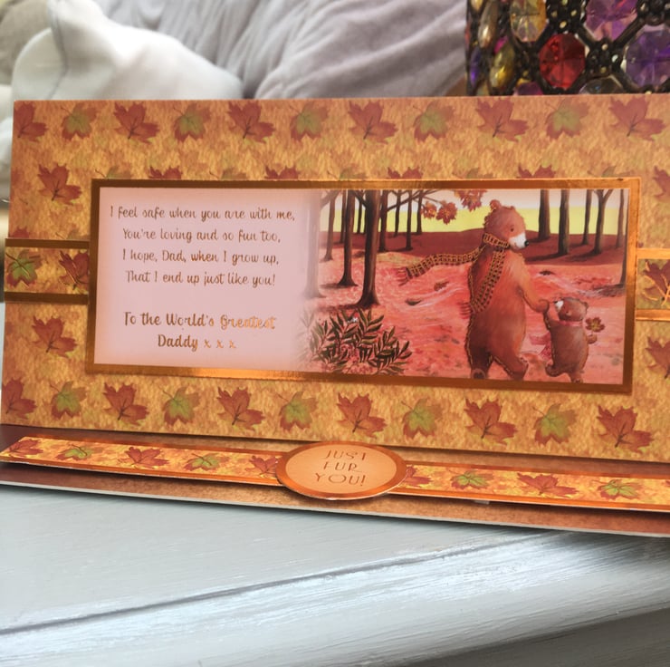 Dad's are special so show them how much you car. This DL sized easel card, 21x10cm in size is a lovely tribute to a dad. The main image is of a bear and a cub going for a walk in the woods. It has a verse that says 'I feel safe when you are with me, you're loving and so fun too. I hope, Dad, when I grow up, That I end up just like you. To the world's greatest daddy. The background is lovely red and green leaves. The easel base is brown with a band of leaves acting as a stop. A round disc has the greeting Just for you. This card would be just right for Father's day or a birthday, go on, spoil your dad.