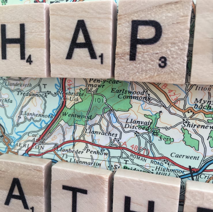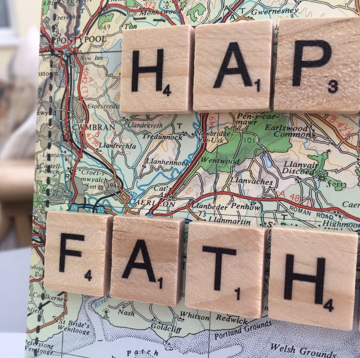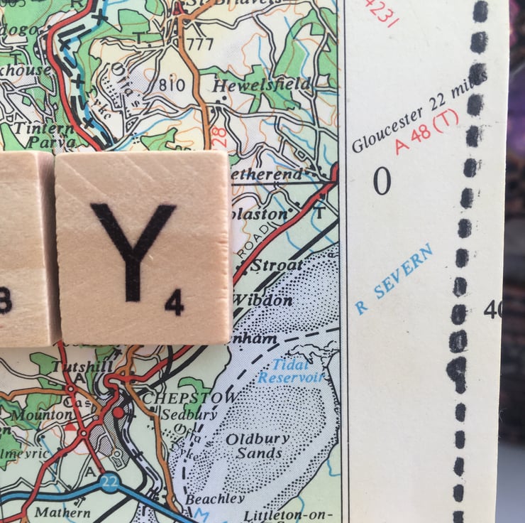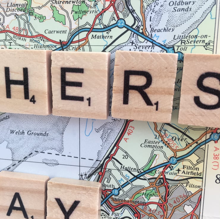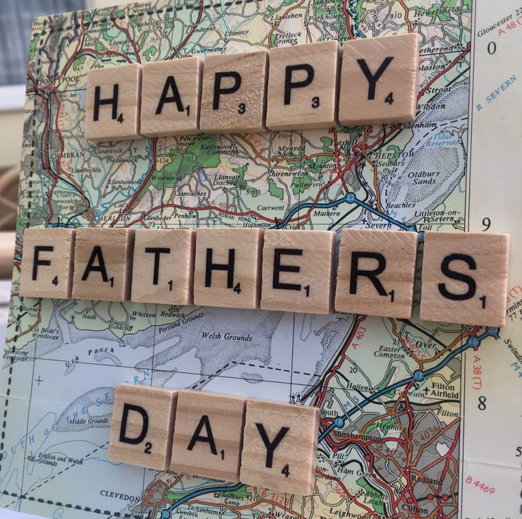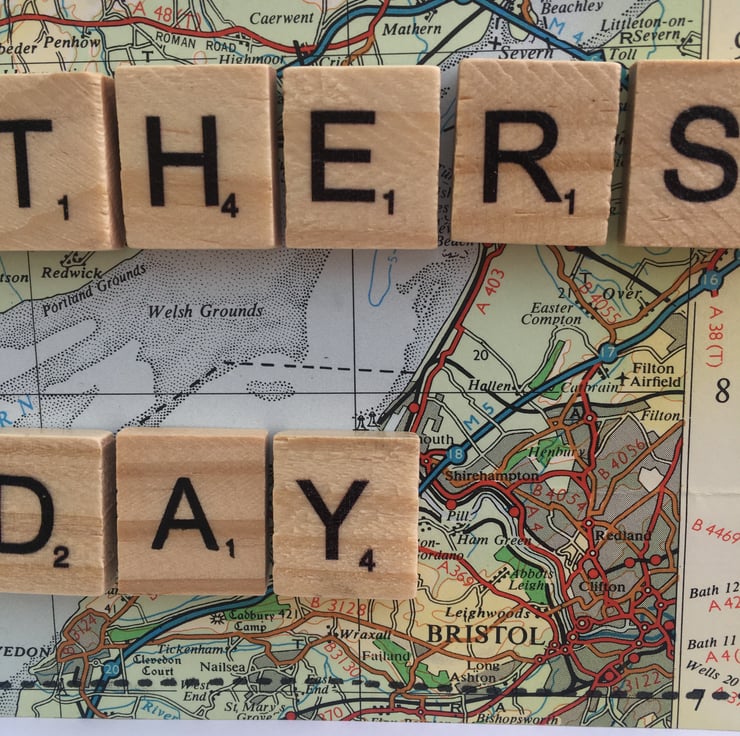 Something a bit different for a Father's day card. This 15x15cm square card is unique. It sports a genuine OS map background, vintage of course. It is of the Bristol channel, Bristol and parts of South Wales. Scabble tiles spell out Happy Father's Day. A dashed border finishes the design. Inside the card has Dad spelt out in ornate stamped lettering. A truly unique greeting to celebrate Father's day. Reusing the map for a lovely keepsake card prevents it from being thrown away or going to landfill.
