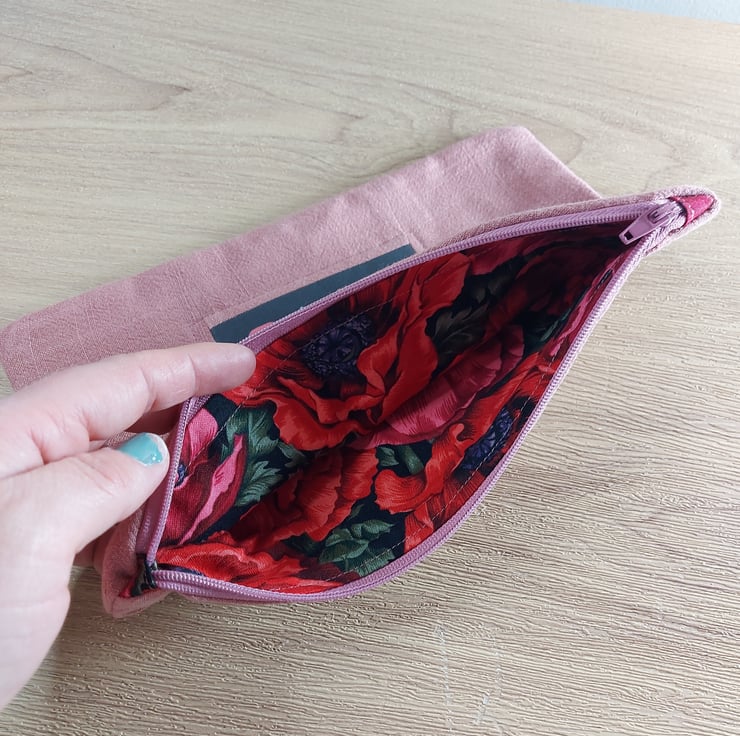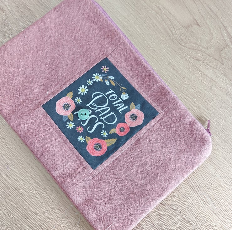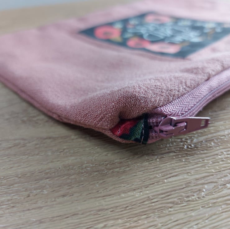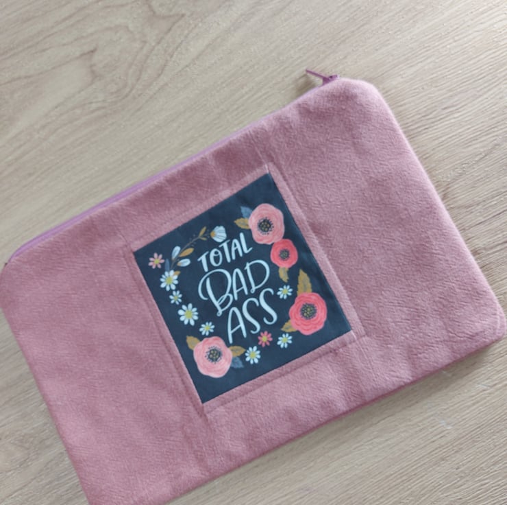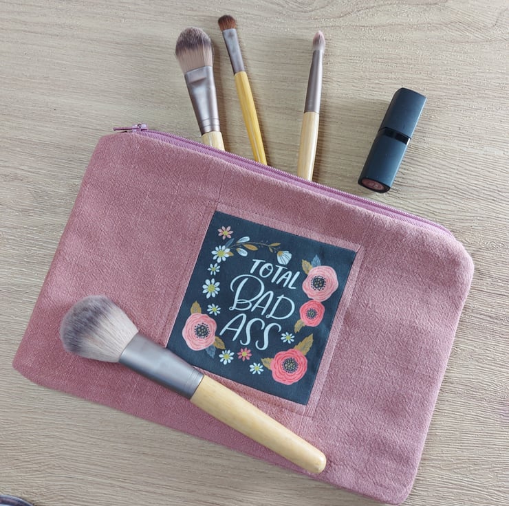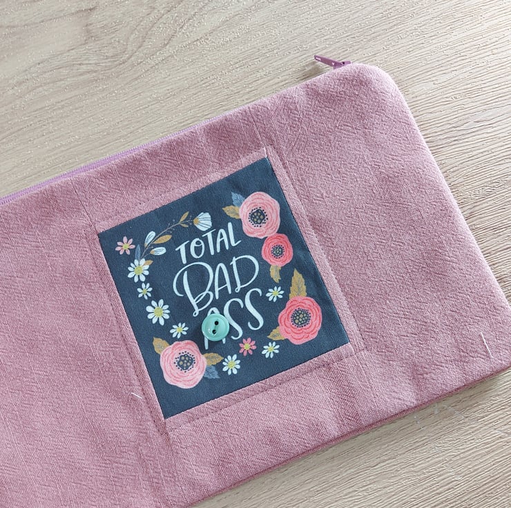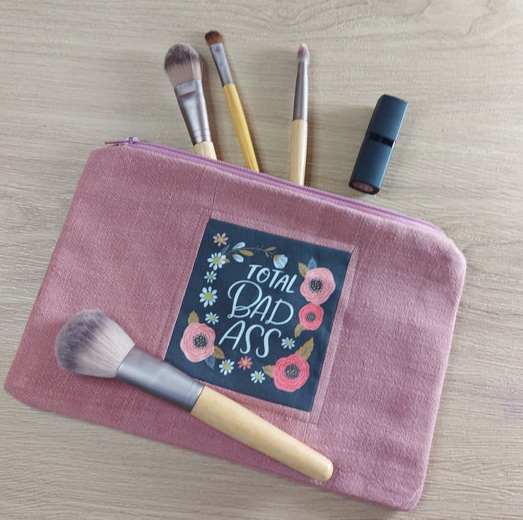 This is a hand made one of a kind make up bag or pencil case users choice , in a beautiful dusty pink linen. The lining is big red poppies . The real feature of this range is the panel on the centre front of the bag this one reads '' Total bad -ss '' surrounded by wild flowers . This hole collection is a little bit cheeky but all beautifully don there are no repeats in this collection so every bag is a one off they are all also roughly 10 by 6 inches with a 9 inch zip .
