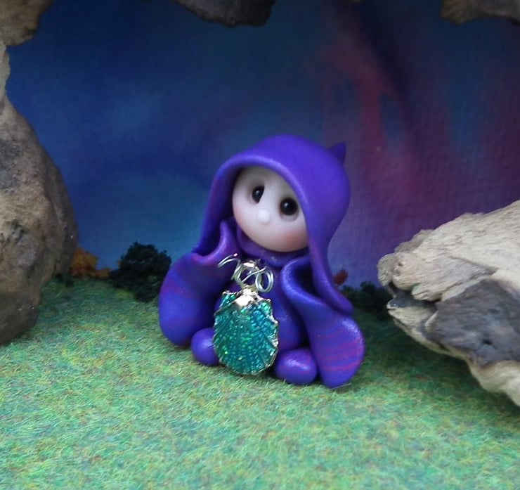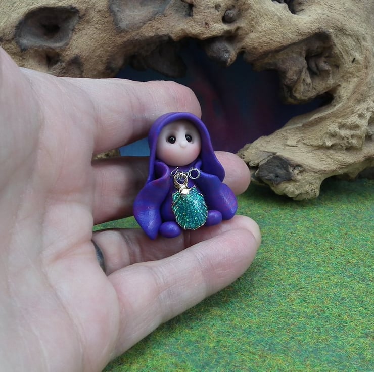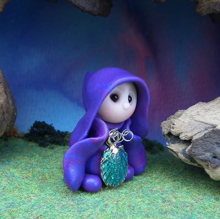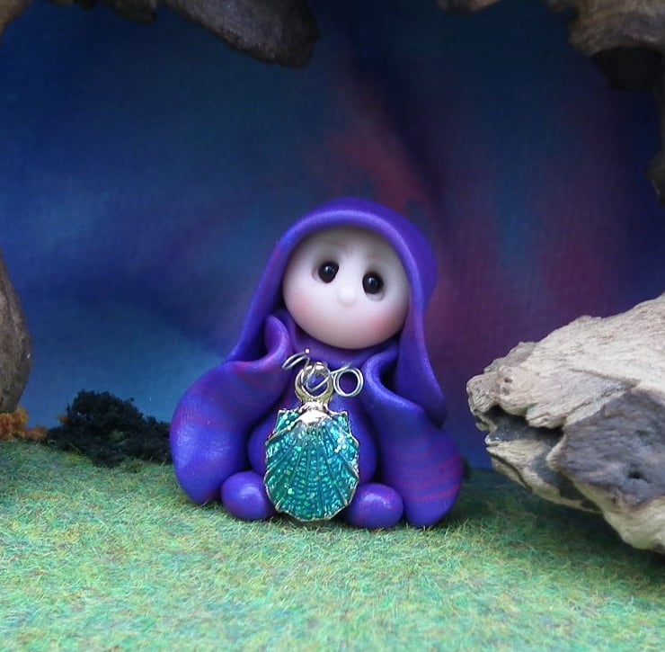 This is a 'one of a kind' creation having been entirely handmade without the use of moulds here at my studio on the Sussex Coast. Modelled with Prosculpt polymers, painted with heat set paints before sealing with lacquer, Suri has sparkling black onyx eyes and wired metal seashell. Suri the Gnome Maiden is just one and a half inches tall.