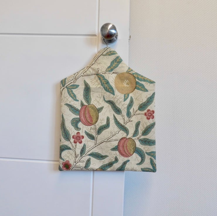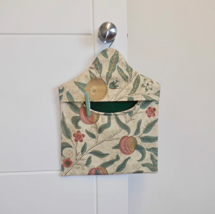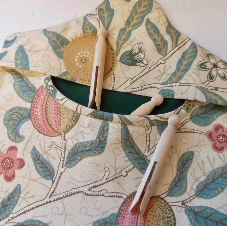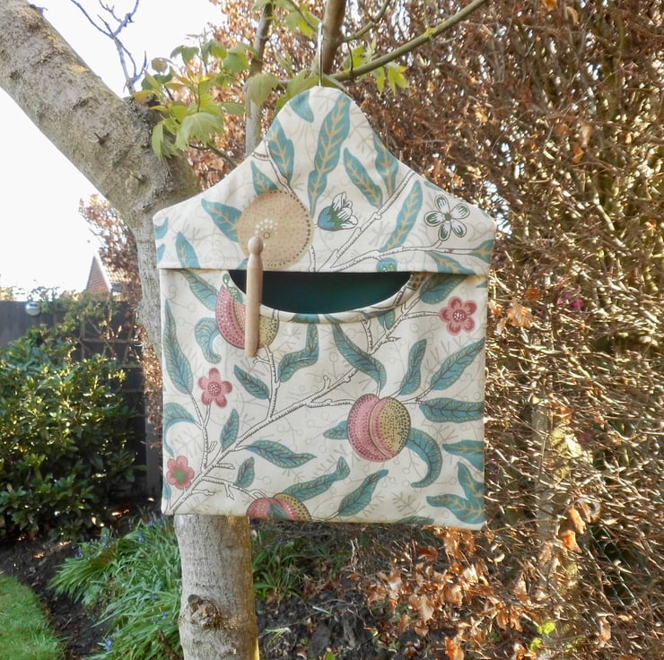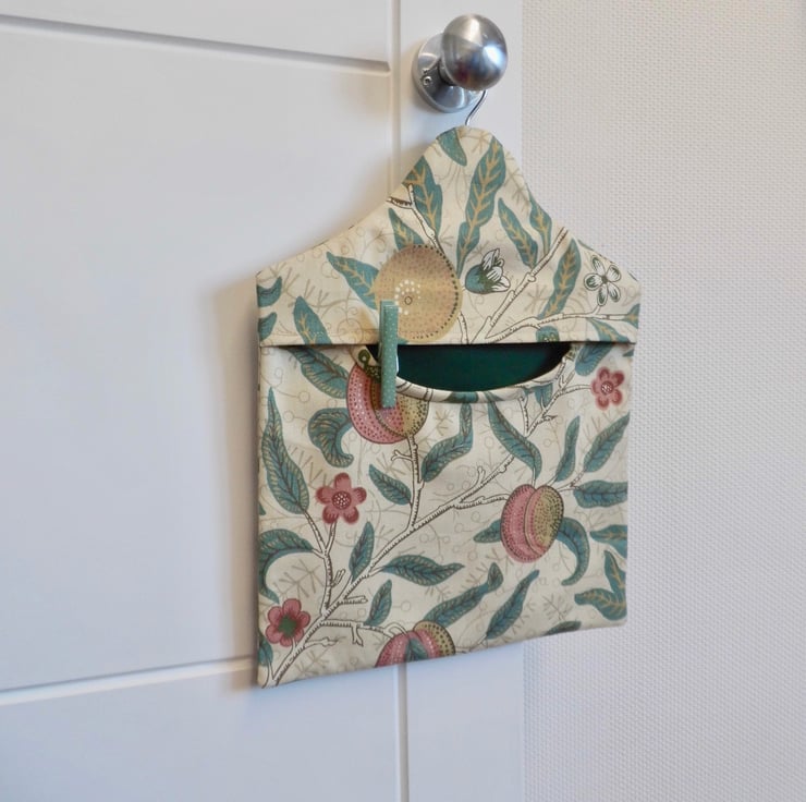 A fully lined peg bag made with a sturdy, mid-weight cotton fabric by Sanderson which has an antique cream background and print of fruit, leaves and flowers in soft colours. The back is lined with a contrasting dark green fabric and you can see this through the opening. The front is lined with cream cotton fabric.