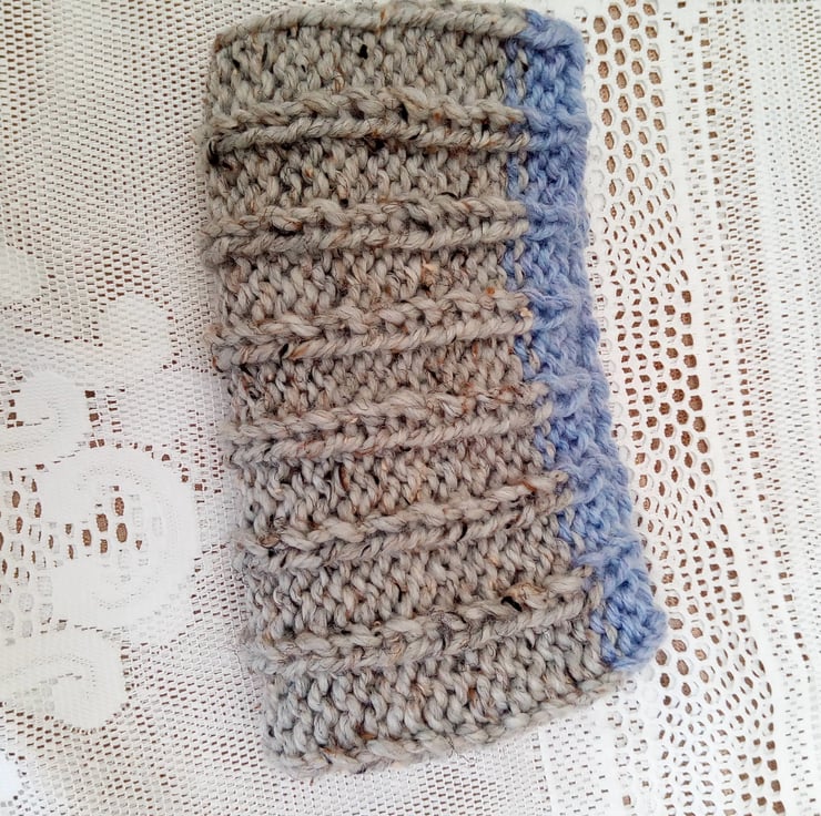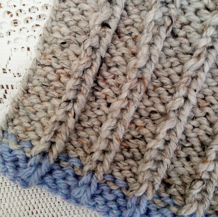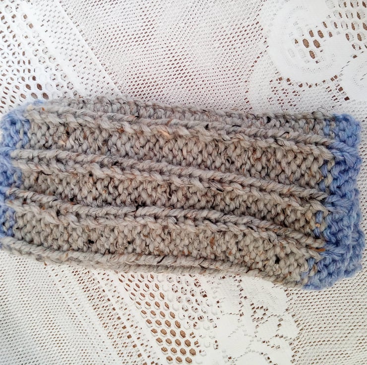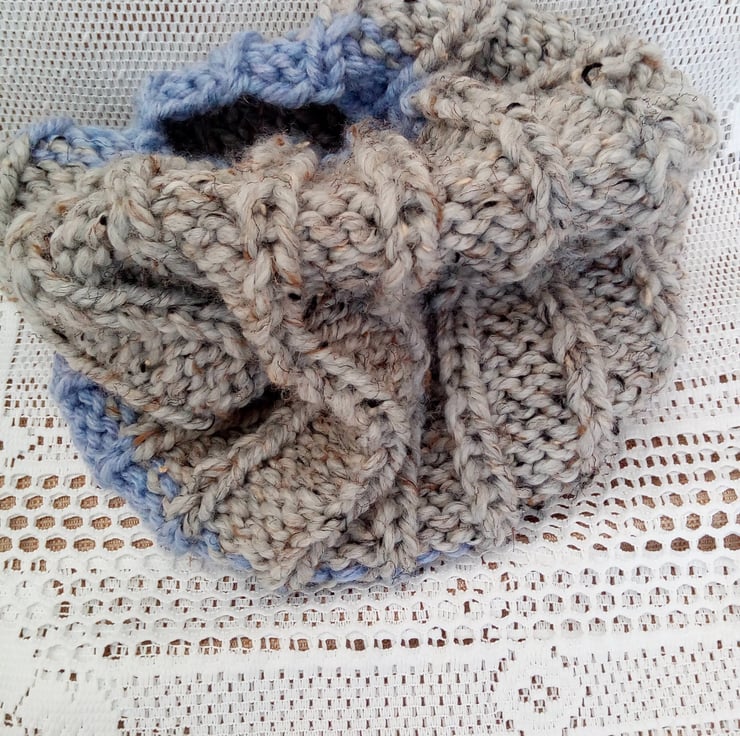 Warm and snuggly wide ribbed child's snood hand knitted in super chunky weight yarn. The snood is in stock in this pale blue and grey colour shown. It can also be made for you in a size and colour of your choice, just state colour required when you order. It one size for all up to the age of 10. The processing time for this snood would be 1 - 2 weeks to produce and post to you.