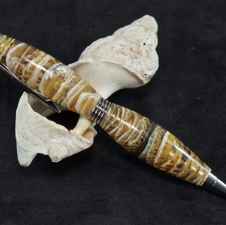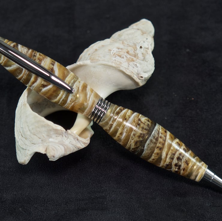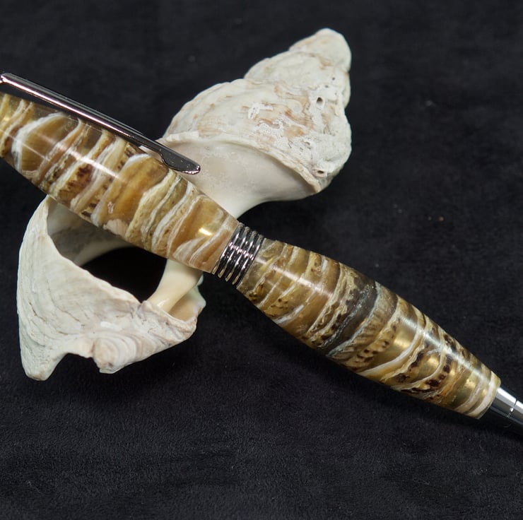 Made with real limpet shells, I created this pen by drilling the through the apex of the shells and threading them onto the chassis-tube, before covering them with the resin binder. When cured, the whole thing is turned on my lathe. This stunning little piece of Orkney has chrome finished metal fittings, is 135mm long, about 16mm diameter, weighs 41g and uses Cross refills, available everywhere.