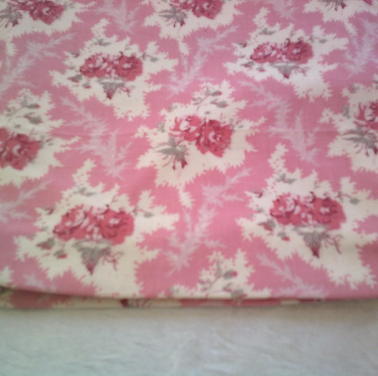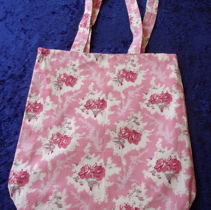 The fabric used is Pink and cream with sprays of darker pink flowers. It is also fully lined and machine washable.