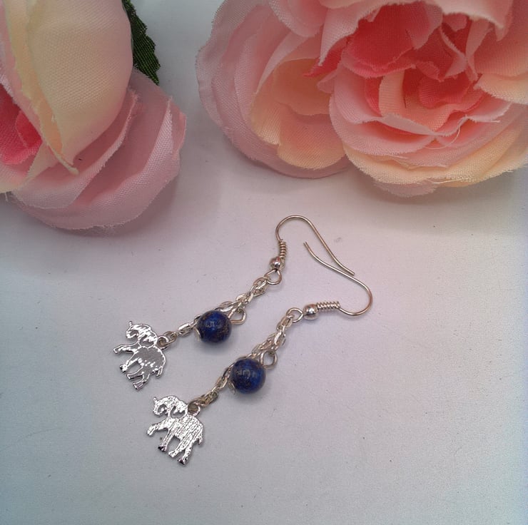 Earrings with Lapis Lazuli and a Silver Elephant on Silver Chain, Gift for Her