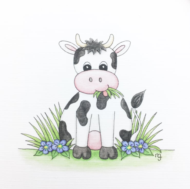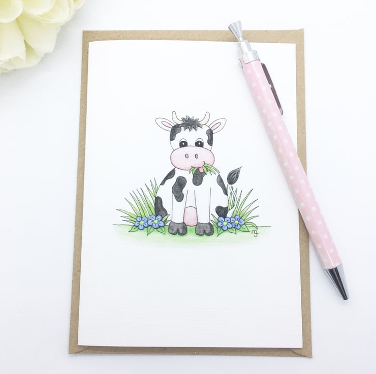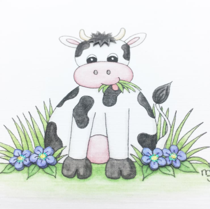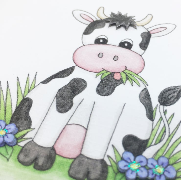 This cute Moo Cow card has been designed using my own original illustration. The image has been printed out onto good quality white linen embossed card and decoupaged up in parts. I have also added a little glitter detail.